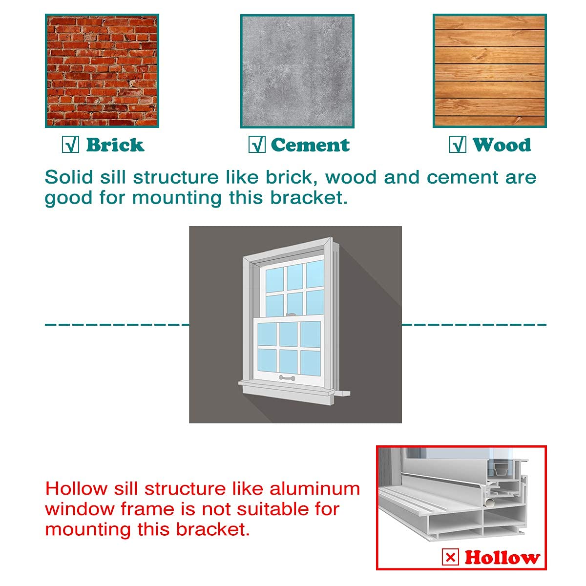 Daisypower Window A/C Bracket Support 85 Lbs, 5,000 -10,000 Btu Features:* Easy Installation Without Outdoor Work, Safety And Quick To Install Indoor. * Built-In Bubble Level Indicator For Quick Adjustment, Anti-Skidding Rubber Foot Pad Which Make The Bracket Stable And Sturdy.* Heavy Gauge Steel Structure And Epoxy-Coated Surface Treatment, Which Prevent The Window Air Conditioners Units From Dropping Out Of The Window And Durable Using. Window Requirement: * This Bracket Will Work On Hung Window With Sill, Which Needs Space On Window Sill To Put Anchors For Mounting. The Sill Should Provide 2'' To 15'' Space;* For Aluminum Window, Guide Holes Need To Be Drilled Through The Aluminum Sill, And Drill Into The Wall (Wooden Or Cement ) For Screw Anchors;* If Your Aluminum Window Frame Is In Hollow Structure, Please Consult With An Expert Before Placing An Order;* This Window Ac Bracket Is Not For Casement Window. How To Install:1. Find The Gravitation Center Of Your Window Air Conditioner Units, Locate The Correct Window Sill Position And Drill Holes Into Mark On Sill;2. Mount Concave Block To The Holes As Anchor, Add Spacers And Mount The Supporting Bracket On It ;3. Check If The A/C Support Will Clear All Obstacles On Sill, Add Flat Spacers To Provide Enough High If Necessary;4. Install The Leg Under The Support Body, Adjust And Place The Footpad Of The Leg Against Exterior Wall;5. Adjust The Position Of Leg, Unit Should Be Self-Supporting Against The Exterior Wall With Slight Downward Tilt ( Condensate Draining);6. Then Install Air Conditioner Following Manufacturers Instructions.Notes:For More Installation Details, You Can Find The Installation Instruction Of Each Package.In The Box1 X Support Bracket Body1 X Support Bracket Leg1 X Set Of Necessary Hardwares