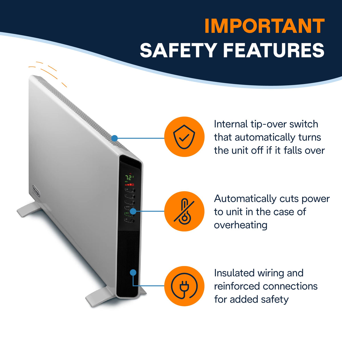 This Sleek, Stylish Panel Heater By De'Longhi Is Perfect For Any Application And Any Decor. With Instant Heat And Its Unique Dual Fan System The De'Longhi Slimstyle Heater Quickly Warms Up Your Coldest Rooms. Don'T Have Enough Space? With Its Slim Design And Convenient Wall Mountable Option, You Can Virtually Put This Heater Anywhere. It Is Ideal For Use As Supplementary Or Spot Heating In The Bedroom, Living Room, Office Or Anywhere In The Home. You Can Customize Your Heating Needs With The Adjustable Thermostat And Three Heat Settings. You Can Rest Easy Knowing That This Heater Has A Safety Thermal Cut-Off, So It Doesnt Overheat, An Internal Tip-Over Switch In Case The Unit Becomes Unstable And Power/Caution Indicator Lights.