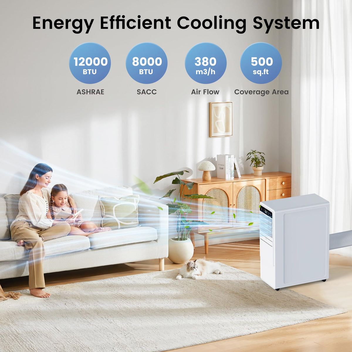 The Domanki Portable Air Conditioner Is A High-Efficiency Air Conditioning Unit With 12,000 Btu Ashrae (8,000 Btu Sacc) Cooling Capacity To Ensure Safety And Performance. It Delivers Rapid Localised Effective Cooling In Minutes And Is Suitable For Rooms Up To 450 Square Feet Such As Renters, Offices, Small Shops Or Any Space That Needs To Be Cooled Quickly 1. Cooling, Fan, Dehumidifying And Automatic Modes, One Machine Is Multi-Purpose To Meet Your Various Needs. 2. Led Display And Remote Control, 25 Feet Remote Control, Easy To Operate, So You Can Easily Adjust The Temperature From Your Couch. 3. Self-Evaporating Condensate Design, No Need To Manually Drain The Water, Simplify Daily Maintenance. 4. Sleep Mode Lower To 48Db, Intelligent Timer Function Can Preset The Switch Time From 0.5-24 Hours, Help You Save Energy And Power, While Providing You With A Quiet And Comfortable Sleeping Environment. 5.Compact Shape With 360 Pulleys And Built-In Handle, The Product Comes With A Full Set Of Window Mounting Accessories And Exhaust Duct.