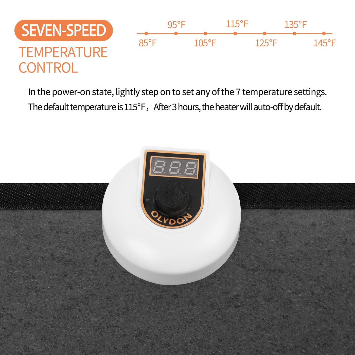 Q: How does the Electric Heated Floor Mat work?A: The Electric Heated Floor Mat uses advanced heating technology to warm your feet quickly and efficiently. Simply plug it in, select your desired temperature using the foot switch, and enjoy the soothing heat.