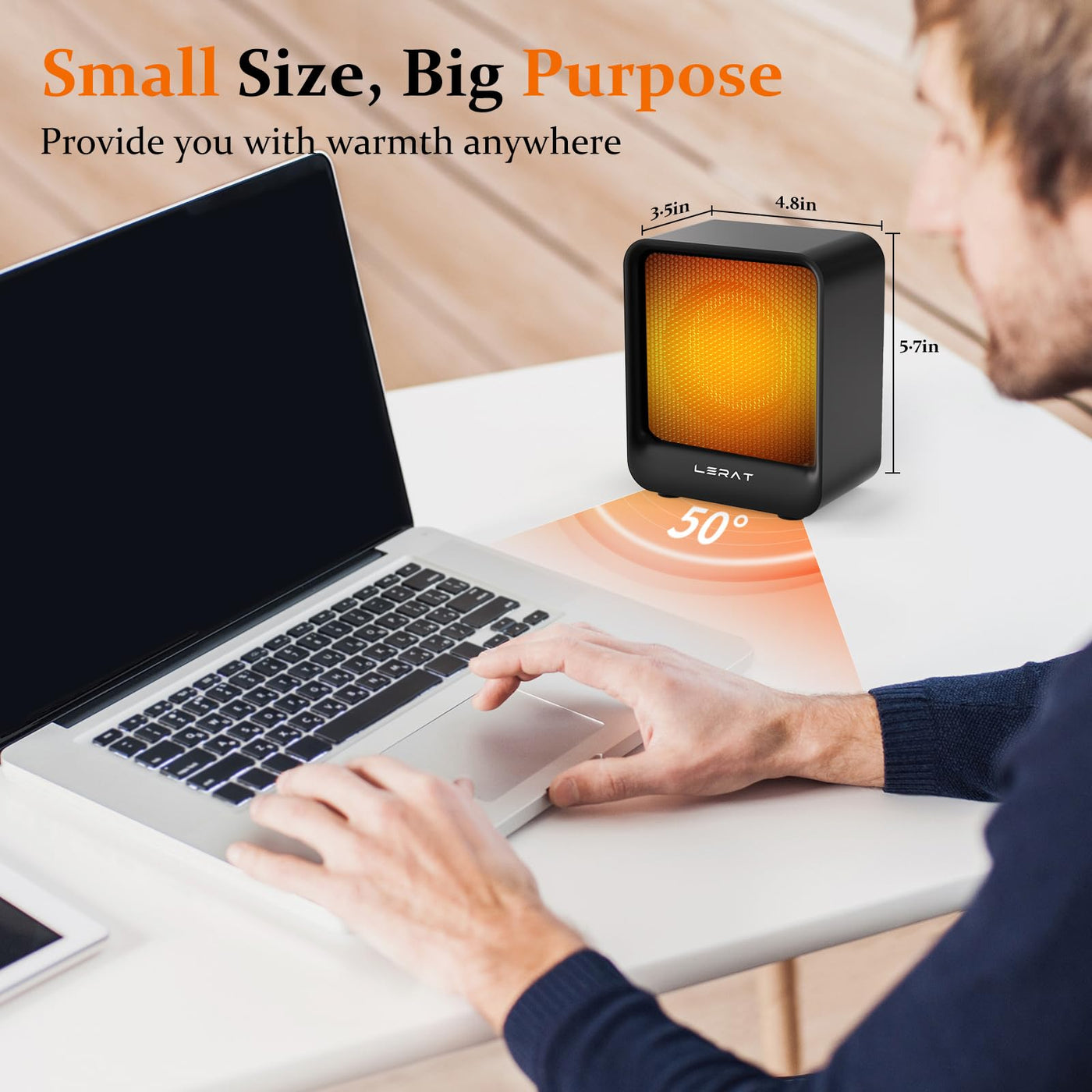 Q: What are the dimensions of the Lerat Electric Space Heater?A: The product size is compact, measuring 4.72 x 5.69 x 3.51 inches, making it ideal for personal use on office desks, camping trips, or in small rooms.