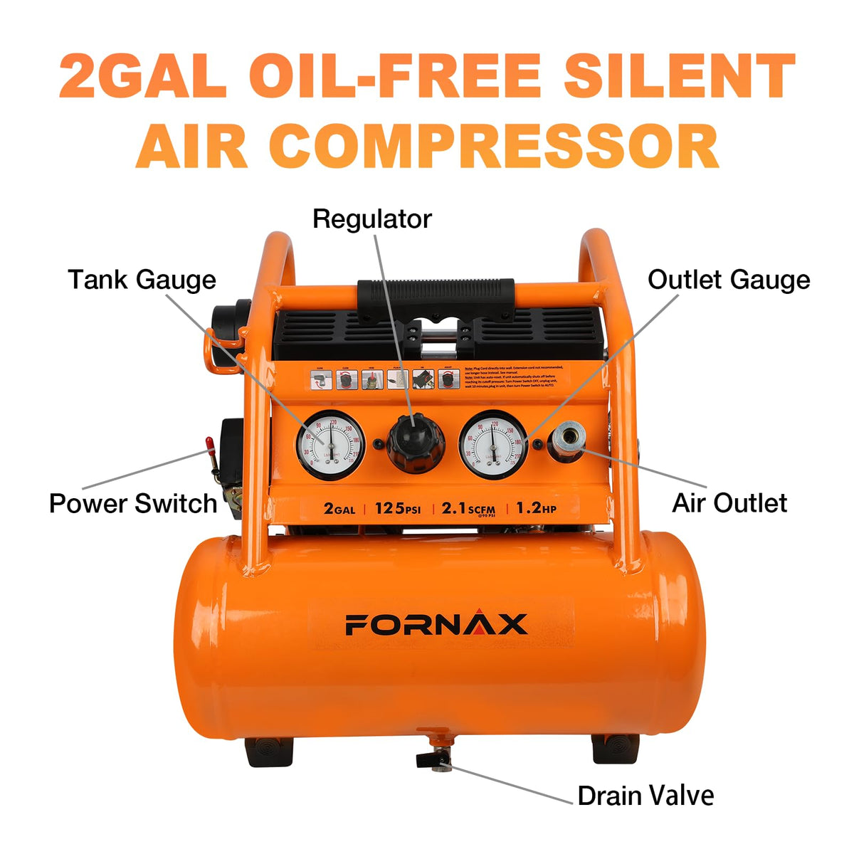 Fornax Air Compressor Portable 2 Gallon, 1.2 Hp 2.1 Scfm@ 90 Psi Oil Free, Max Pressure 135 Psi, 65 Db Silent Air Compressor For