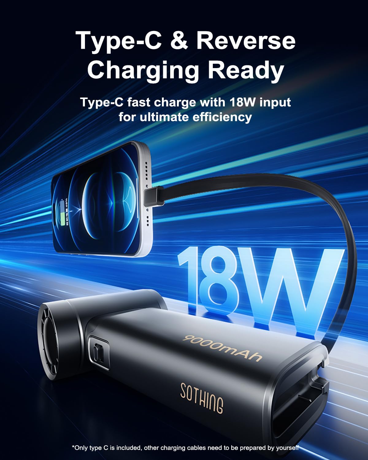 Stay Cool And Stay Charged With Sothing Engine Power - The Ultimate Portable Handheld Fan The Sothing Engine Power Handheld Fan Is Built For Power Users Who Need More Than Just A Breeze. This Is Not Just A Hand Fan-Its A Feature-Rich Portable Fan With Power Bank Functionality That Delivers Fast, Customizable Cooling While Charging Your Devices On The Go. Turbo-Speed Performance Meets Travel-Friendly Design With A Motor Spinning At Up To 50,000 Rpm And Customizable 100-Speed Settings, This Hand Held Fan Puts Complete Cooling Control In Your Hands. Whether You'Re Relaxing At Home Or Hiking In Summer Heat, The Engine Power Ensures You'Re Always Comfortable. Charge Fast, Stay Cool Longer The Powerful 9000Mah Battery Delivers Up To 48 Hours Of Runtime, And Supports 18W Usb-C Fast Charging-Reach 60% In Just 30 Minutes. Perfect For Those Who Need A Reliable Portable Fan With Charger Power Bank Feature For Daily Life Or Travel. Smart Display, Smart Carrying The Built-In Led Display Shows Battery And Speed Settings Clearly, While The Usb-C Cable Doubles As A Convenient Hand Strap. This Kind Of Thoughtful Design Makes It The Go-To Personal Fan For Smart Users. Designed For Life On The Move Whether You Call It A Handheld Fan, Hand Fan, Or Portable Fan For Travel, The Engine Power Is Compact, Lightweight, And Quiet Enough For Airplanes, Offices, Or Hotel Rooms. Noise Levels Stay Between 50-83Db, While The Durable Build Ensures Long-Term Reliability. Why Sothing Engine Power? Because You Deserve A Cooling Device Thats Just As Dynamic As Your Lifestyle. As A Powerful Power Bank Fan And A Reliable Handheld Fan, Its The Only Fan You Need This Summer-Compact Enough To Fit In Your Pocket, Strong Enough To Beat The Heat.