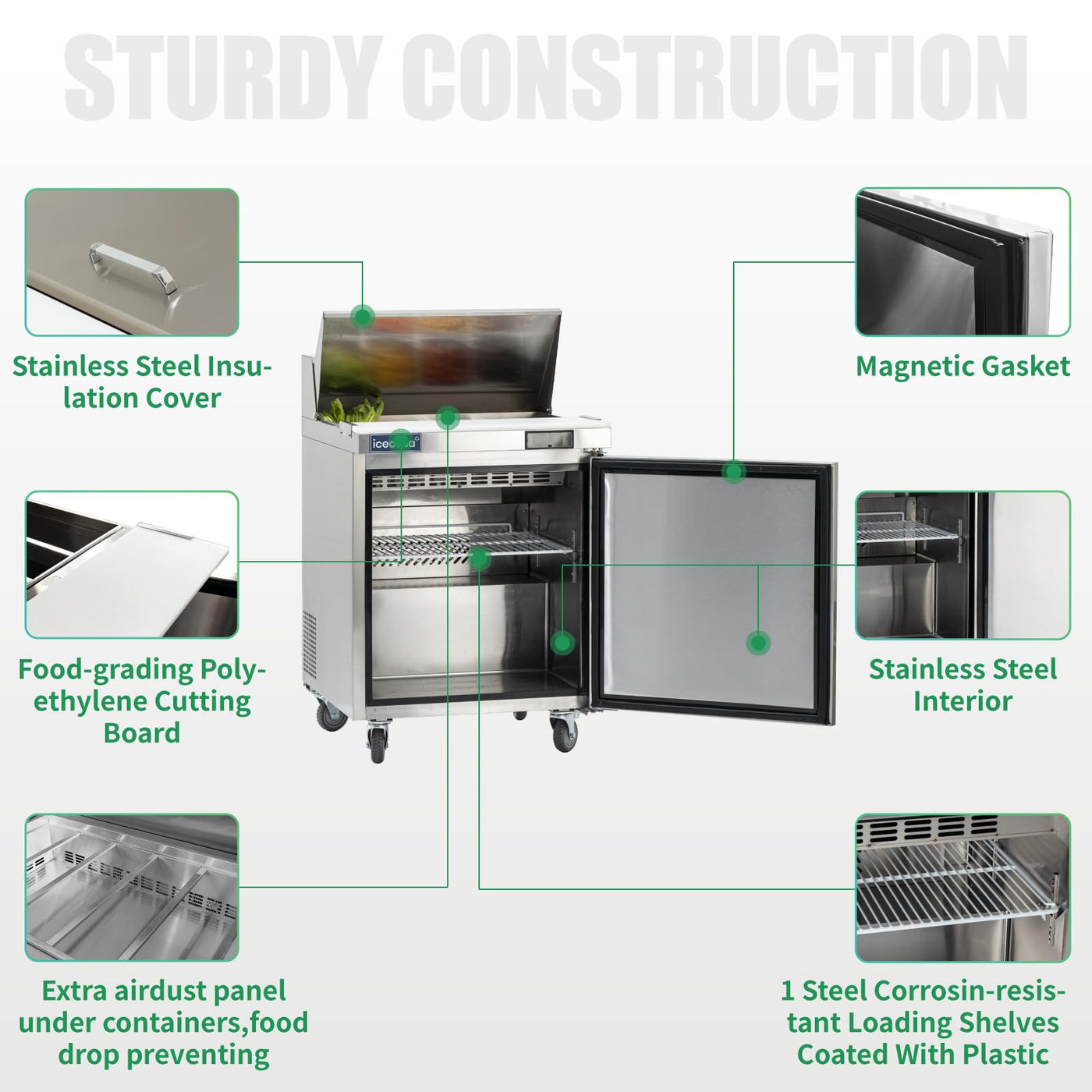 Icecasa 27'' W Commercial Refrigerator Sandwich&Salad Prep Table Single Door Stainless Steel Counter Fan Cooling Refrigerator Wi