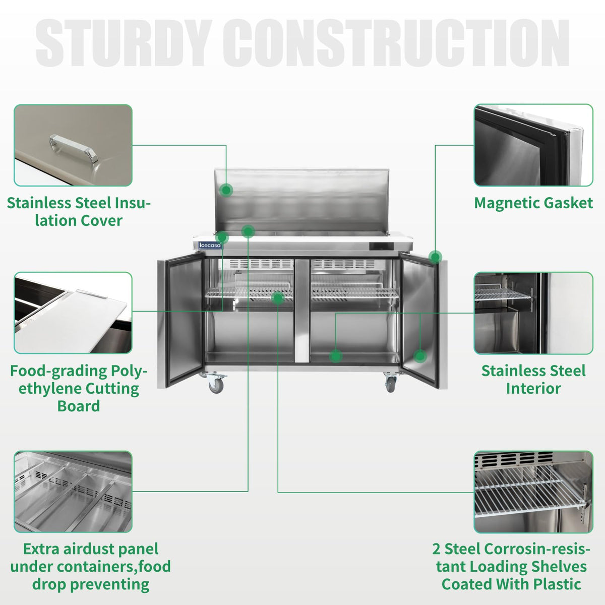Icecasa 48'' W Commercial Refrigerator Sandwich&Salad Prep Table Mega Top Single Door Stainless Steel Counter Fan Cooling Refrig