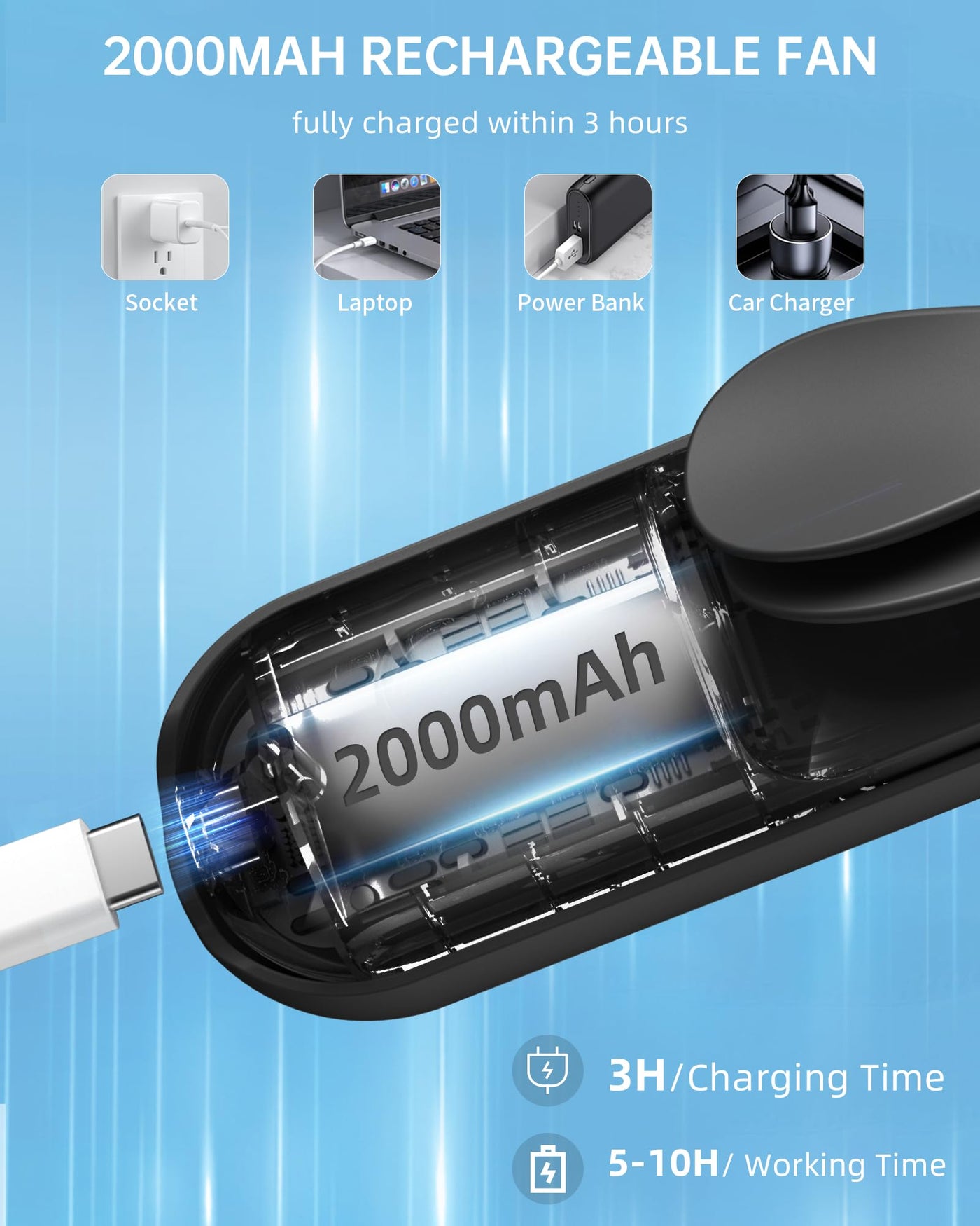 Q: How do you charge the Jkjoy Mini Handheld Fan?A: The fan is USB rechargeable, allowing you to charge it conveniently with any USB power source, eliminating the need for battery replacements.