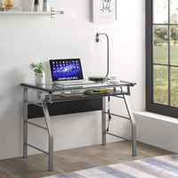 This Home Office Computer Desk/Table Made Of Metal With Glass Top. Square Metal Tube With Silver Finish. Simple Design And Easy For Assembly. Side Shelf Creates Plenty Space For Storage. Full Size Keyboard Tray, 8-Mm Clear Glass. Measures 39-1/2-Inch Length By 23-2/3-Inch Width By 29-1/2-Inch Height.