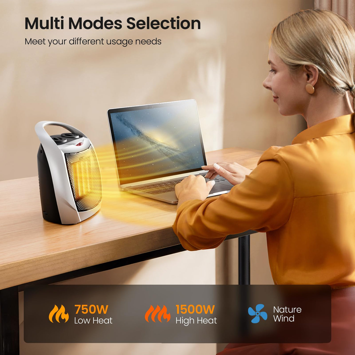 Small Heater Measures - Our Portable Space Heaters With Size Of 7.28'' X 5.31'' X 9.45''.Equipped With A Cord.Energy Efficient,Fully Assembled,Ptc Technology.Compact Space Saving Design.Convenient Carry Handle. Adjustable Thermostat For Comfortable Warmth-Ideal For Small Areas | Ceramic Space Hearer - Advanced Ceramic Heating Elements Provide Faster And More Efficient Heating Than Traditional Heaters.Ceramic Space Heaters Can Quick Heating Within 2S ,Produce Abundant Heat Without Open Coils, And Are Long Lasting.Small And Powerful This Is The Perfect Space Heater For Bedroom, Office And Under Desk Use. | Three Heat Settings With Fan - 1.High Heat (1500-Watt), 2. Low Heat (750-Watt ).3.Fan Only For Summer.It Makes The Electric Space Heater Ideal For Warming Up Your Personal Space In Small Home And Office.Reduce Your Energy Bills By Using This Energy Efficient Space Heater To Heat. | Adjustable Thermostat - Combined With An Adjustable Thermostat Control,The Small Portable Heater Can According To The Thermostat Setting Let Your Room Remain At A Comfortable Temperature.And Allows You To Adjust The Heater'S 1500 Watt Ceramic Heating Element. | Advanced Safety Features - 1. Built In Automatic Overheat Protection System Will Shut The Unit Off When The Parts Of The Heater Overheat. 2. Tip-Over Switch Will Shut Off When Tipped Forward Or Backward. 3. Power Indicate Light Can Let You Know At A Glance That It