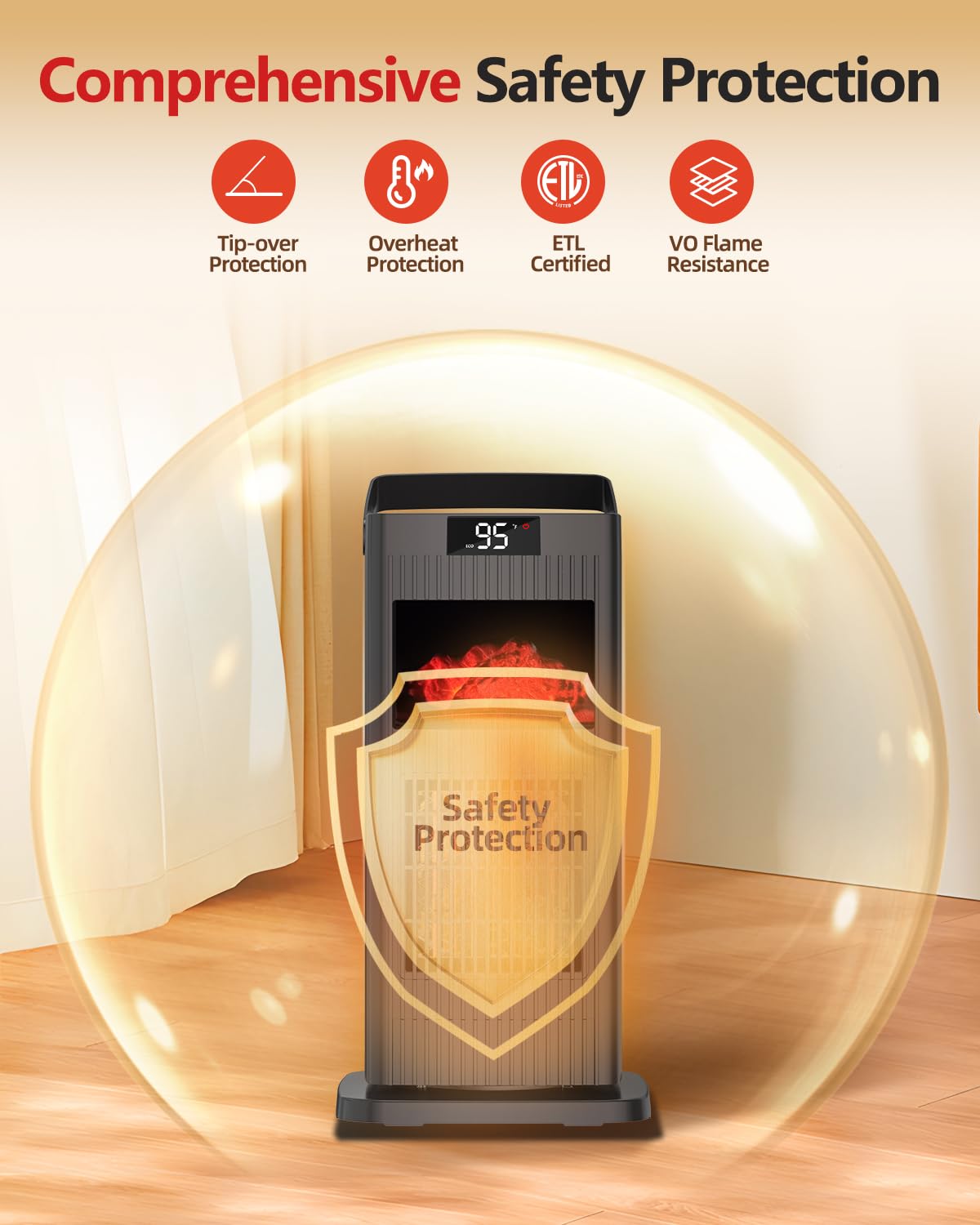 Q: What safety features does the KNKA Space Heater have?A: This space heater is ETL certified and comes with multiple safety features, including tip-over protection, overheating protection, and flame retardant materials, ensuring safe operation even in households with children and pets.