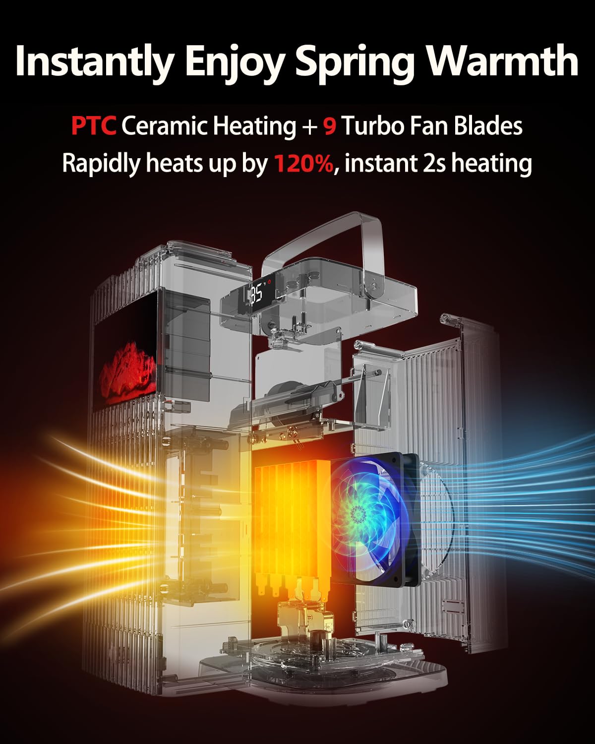 Q: How quickly does the KNKA Space Heater heat a room?A: The KNKA Space Heater utilizes a powerful 1500W PTC ceramic heating system, allowing it to heat a room to 75°F in just 2 seconds, making it significantly faster than traditional heaters.