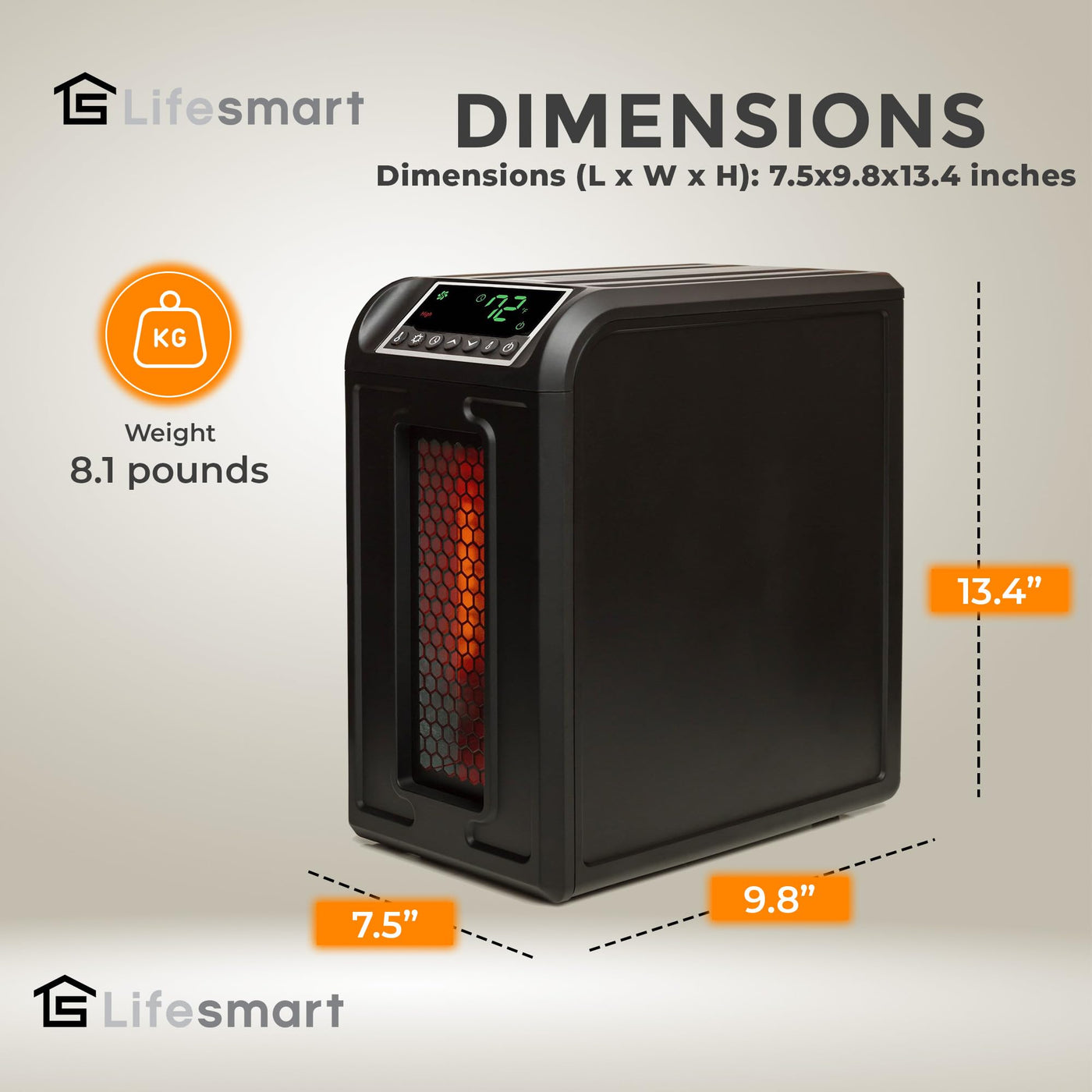 Product Descriptionthe Lifesmart Ls 3 Eco Infrared Heater Offers You Safe, Healthy Heat And Is Ultra-Efficient For A Medium Size Room. This Heater Features 3 Of Our Metal Wrapped Quartz Infrared Elements, Has A Lifetime Washable Air Filter And Only Uses Up To 1500-Watts. All Electrical Components Are Warrantied For 1 Year. There Are 3 Energy Savings Settings Including An Eco Setting That Will Heat Smaller Areas To 68 Degrees Using Only 500-Watt. The Heater Is Surrounded By Our Stylish Black Fireproof Cabinet. The Lightweight Heater Makes It Easy To Carry From Room To Room To Enjoy The Benefits Of Zone Heating. This Compact Heater Also Includes A New Larger Remote Control To Operate The Digital Thermostat Allowing You Ultimate Control. Dual Timer Settings Can Be Used To Turn On Or Off The Unit Up To 12 Hours Ahead.From The Manufacturerthe Lifesmart Ls 3 Eco Infrared Heater Offers You Safe, Healthy Heat And Is Ultra-Efficient For A Medium Size Room. This Heater Features 3 Of Our Metal Wrapped Quartz Infrared Elements, Has A Lifetime Washable Air Filter And Only Uses Up To 1500-Watts. All Electrical Components Are Warrantied For 1 Year. There Are 3 Energy Savings Settings Including An Eco Setting That Will Heat Smaller Areas To 68 Degrees Using Only 500-Watt. The Heater Is Surrounded By Our Stylish Black Fireproof Cabinet. The Lightweight Heater Makes It Easy To Carry From Room To Room To Enjoy The Benefits Of Zone Heating. This Compact Heater Also Includes A New Larger Remote Control To Operate The Digital Thermostat Allowing You Ultimate Control. Dual Timer Settings Can Be Used To Turn On Or Off The Unit Up To 12 Hours Ahead.