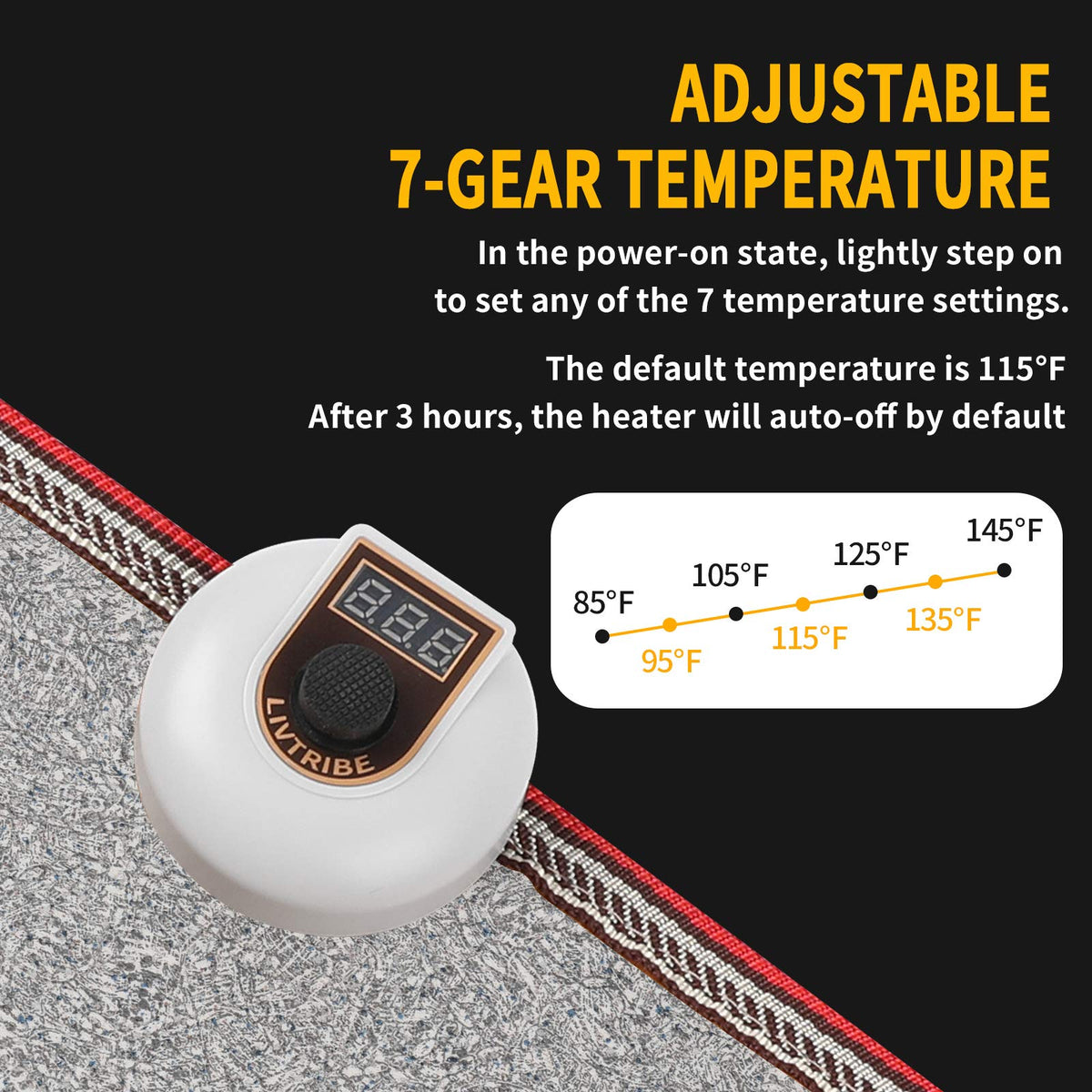 Product Parametersname: Graphene Carbon Crystal Heating Carpetrated Output Power:55Wpower Cord Length: 74.8 Inchtemperature Range: 85F~145Fsize:17.3 In X 12.6 In?This Electric Heating Foot Warmer Uses High-Quality Thermal Conductive Materials, Ensure The Safety Of Use While Providing Warmth, Turn Off Automatically After 3 Hours, You Don'T Worry About Forgeting To Turn It Off.?The Size Of The Electric Heater Is Very Portable, It Can Be Used At Home, Or Taken With You When You Work.?The Power Cord Of This Electric Heating Foot Warmer Is 74.8 Inches Long, So Dont Worry About The Socket Being Too High To Use.?7 Temperature Settings Are 85?, 95?, 105?, 115?, 125?, 135?, 145?.?In The Cold Winter, This Is A Very Considerate Birthday And Holiday Gift, Which Can Be Given To Mom, Dad, Friends Or Anyone You Love.If You Have Other Questions About This Product, Please Feel Free To Contact Us
