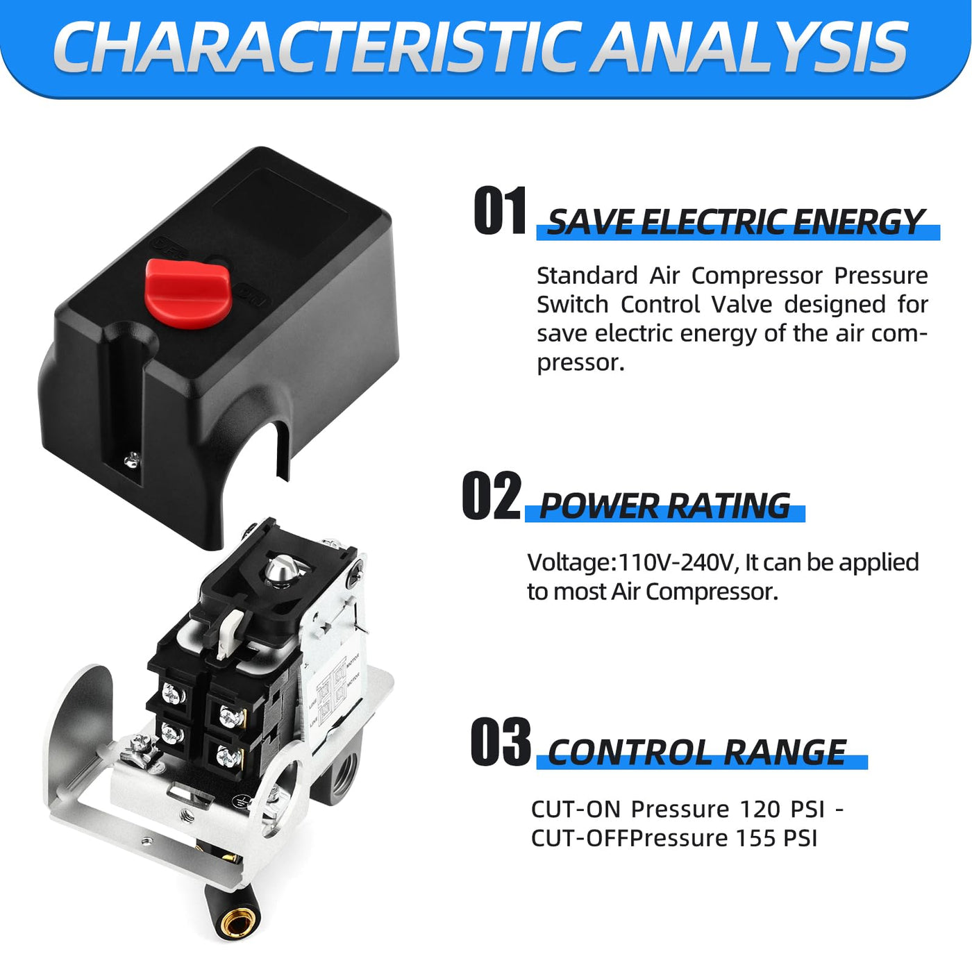 ?Specifications: Material: Plastic + Metal Color: Red, Black Thread Size: 1/4 Maximum Pressure: 120-155 Psi Voltage Range: 110V-240V Design Concept: Auto Control, Save Electric Energy Of The Air Compressor. ?Feature: ?High Strength And Long Service Life. ?Save Electric Energy Of The Air Compressor. ?Thread Is Clear, No Burr On The Surface. ?Easy To Disassemble And Install. ?Package Included: 1 X Air Compressor Switch Control Valve 1 X Pressure Gauge 1 X Air Compressor Moisture Filter 1 X Safety Pressure Relief Valve 1 X Valve Shut Off Switch 2 X Thread Pipe Plug 1 X Nickel-Plated Iron Air Plug 1 X Nickel-Plated Iron Air Coupler 1 X 1/4 1/4 Male Pipe 1 X Hex Wrench 1 X Teflon Tape