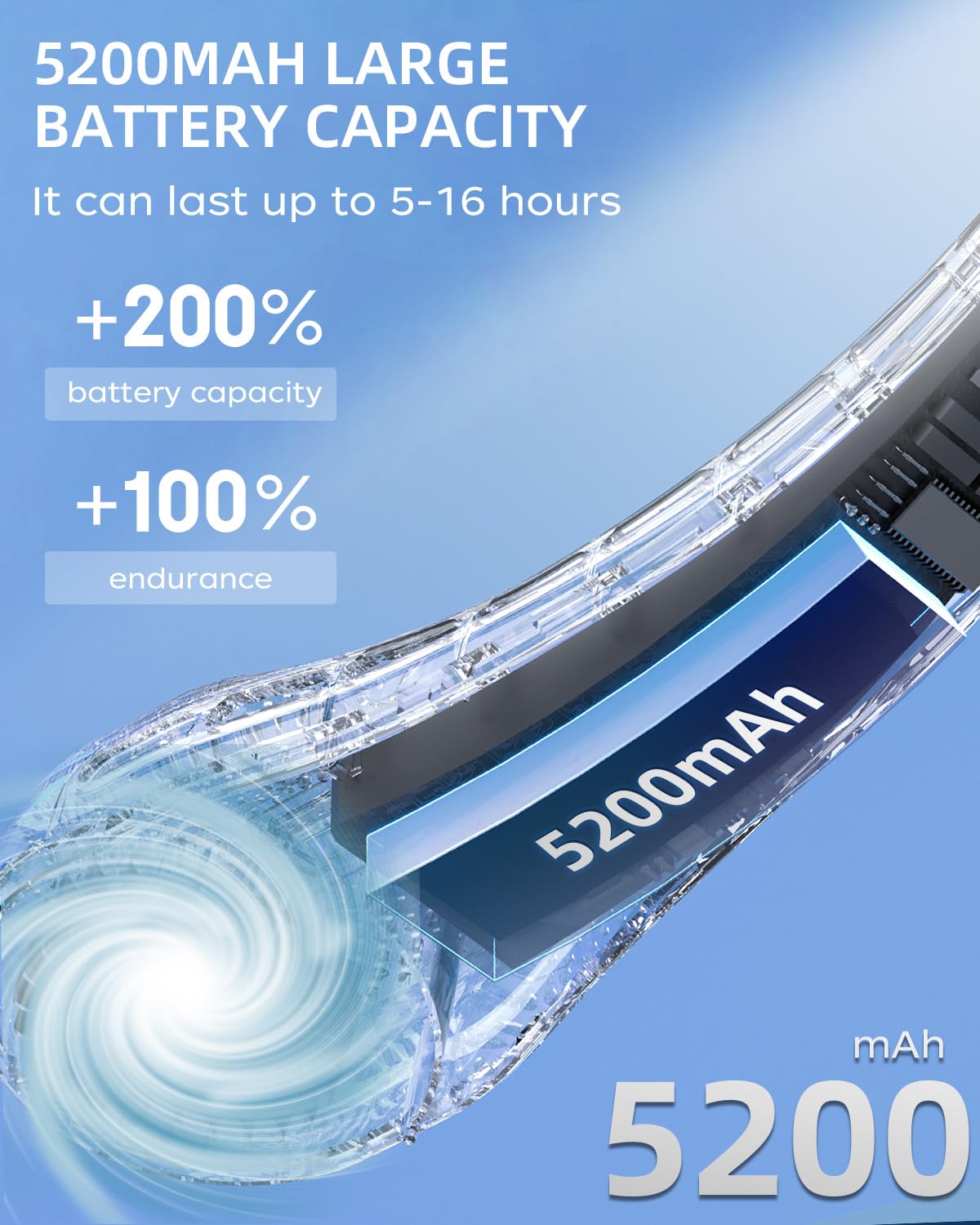 Q: How long does the battery last on the portable neck fan?A: The portable neck fan is equipped with a 5200 mAh battery, providing a running time of approximately 4 to 20 hours depending on the selected wind speed.