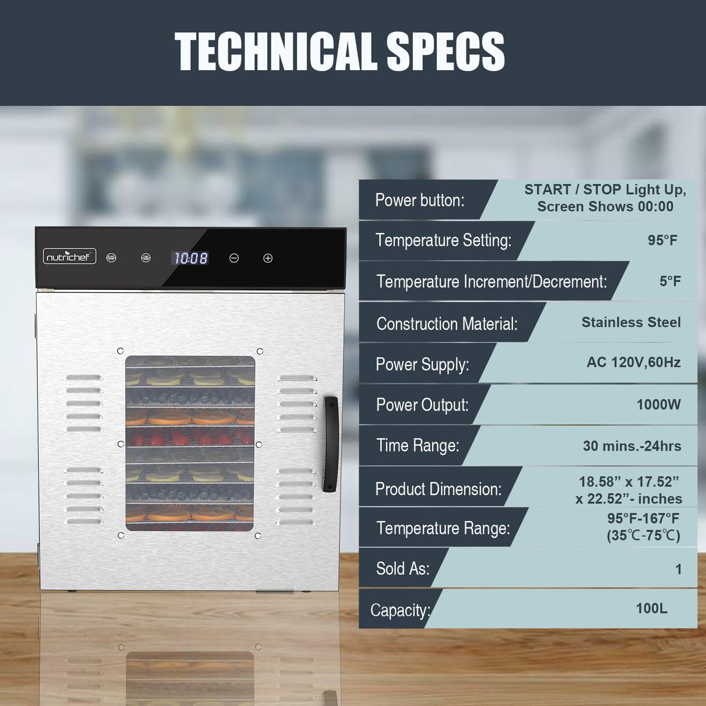 Features: Food-Grade Stainless Steel And Glass Front Door 14 -Layer Living Drawer (15.67 X 12.52) Electronic Probe And Timing Temperature Control 360 Hot Air Circulation Large Capacity With 14 Trays And Up To 59.83 Lbs. Of Food Dehydrate At Once Switch Door Magnetic Induction Built-In Rear-Mounted Motor And Internal Fan Circulates Warm Air Easy To Store And Clean Safe And Quiet To Use Touch-Control Led Display Dishwasher Safe Automatic Shut Off Memory Function Includes Overheat Protection Included Mesh Screen & Fruit Roll Sheet Free Recipe Book With 50 Original Recipes Adjustable Time And Temperature Perfect Way To Preserve Fruit, Snacks, Vegetables, Bread, Flowers And More Automatic Shut Off When Timer Is Done Transparent Door Allows You To Easy Monitor Air Flow: Horizontal (Back To Front) Whats In The Box: (1) Stainless Steel Food Dehydrator (1) Included Mesh Screen (1) Fruit Roll Sheet (14) Trays Technical Specs: Power Button: Start/Stop Light Up, Screen Shows 00:00 Temperature Setting: 170F Temperature Increment/Decrement: 5F Construction Material: Stainless Steel Power Supply: Ac 120V, 50Hz Power Output: 1000W Time Range: 30 Mins. - 24 Hrs. Temperature Range: 95F-170F (35C-76C) Product Dimension: 18.58 X 17.52 X 22.52 -Inches Sold As: 1 Weight: 0 Lbs.