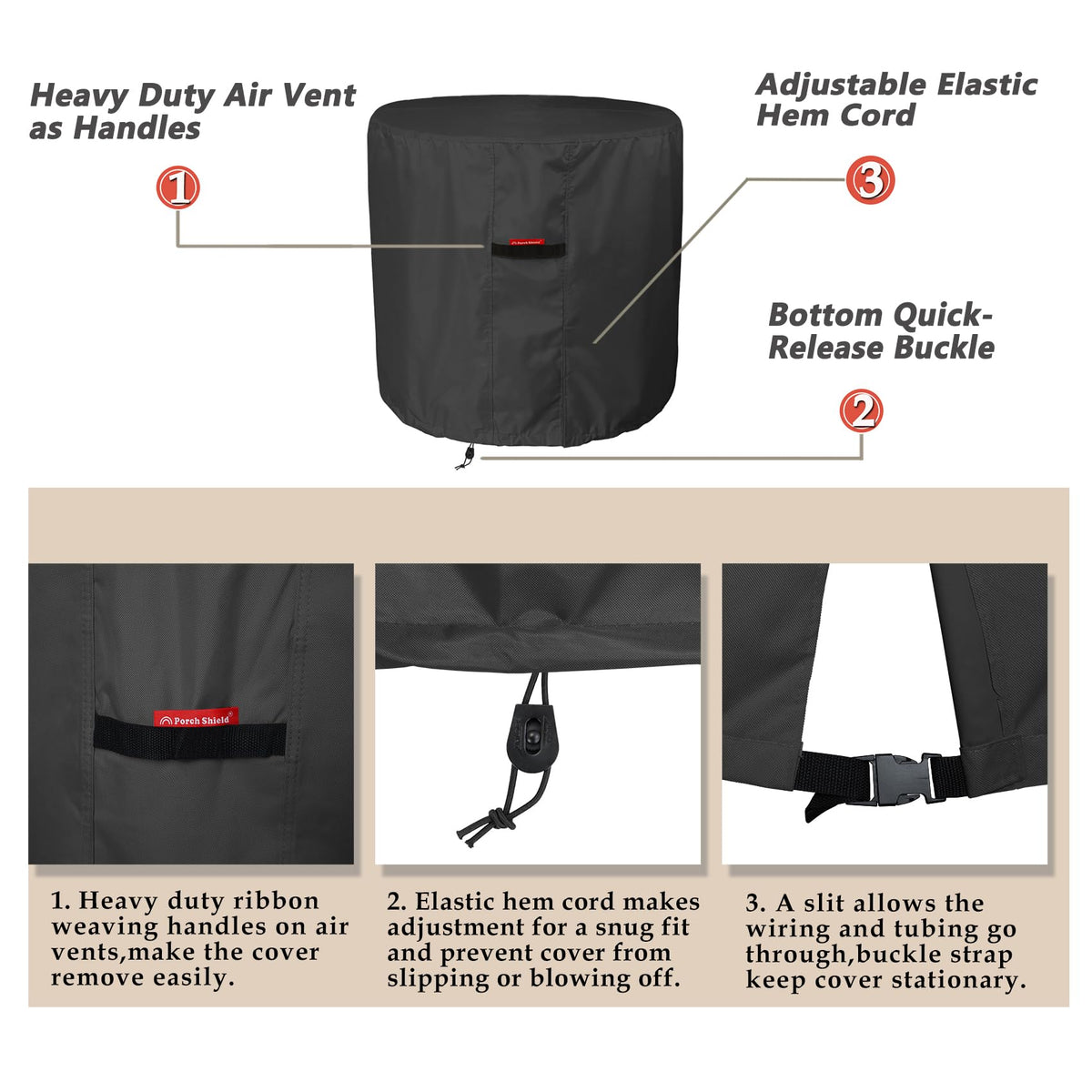 About Porch Shield Air Conditioner Cover 1. Made Of 600D Heavy Duty Fabric With Waterproof Coating. Thicker Than Most Of Air Conditioner Covers, Provides From Leaves, Ice, Debris, Snow, Etc. 2. Fit Round Air Conditioners 34'' Diameter X 30'' High. 3. Two Air Vents At Sides With Mesh Can Keep Leaves Out. 4. Double Stitched Seams Add Strength To The Whole Cover. 5. Elastic Hem Cord And Bottom Strap For Custom Secure Fit. 6. A Bottom Buckle Also Secure The Cover With Air Conditioner Lines. 7. Come With An Extra Square Of Material To Use As A Patch. About Porch Shield Not Only Will Your Patio Furniture Be Protected From The Elements, But Youll Be Protected In The Industry.
