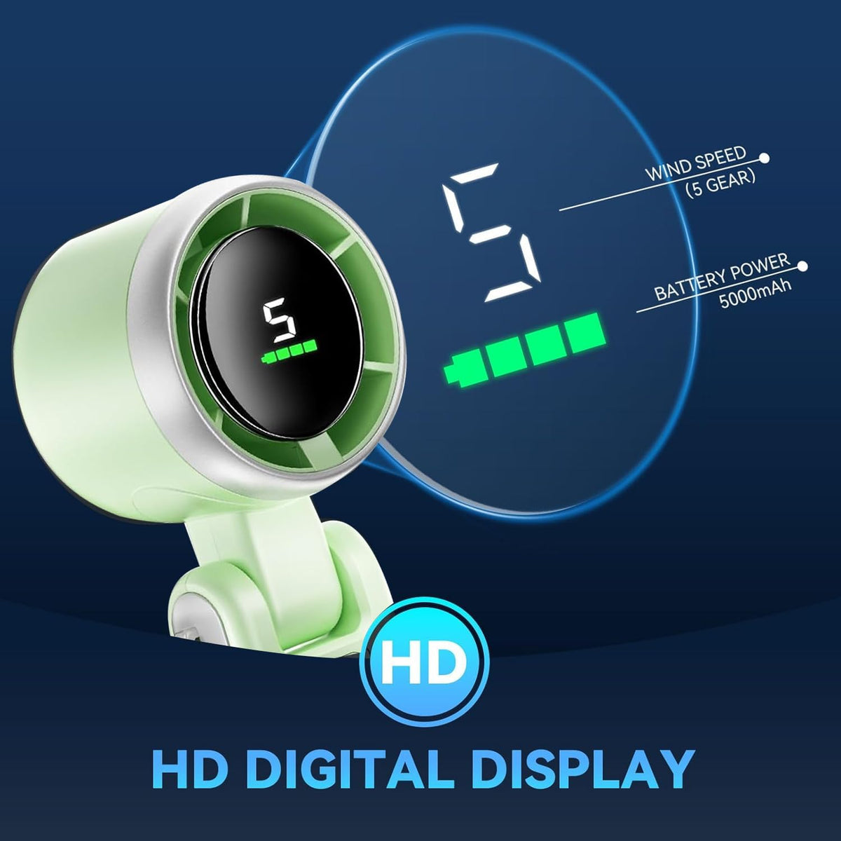 Q: What are the wind speed settings available on this handheld fan?A: This handheld fan features 5 adjustable wind speed settings, allowing you to customize the airflow from a gentle breeze to a strong wind, catering to your specific cooling needs.