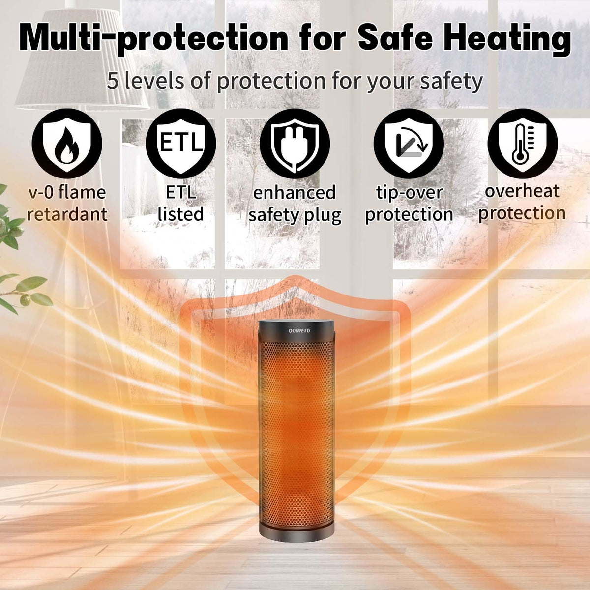Q: Is the QOWETU heater safe to use overnight?A: Yes, the QOWETU heater is ETL-certified for safety and features multiple safety mechanisms, including a smart tip-over protection and overheat protection, making it safe for overnight use.