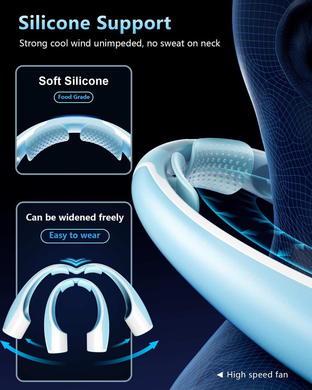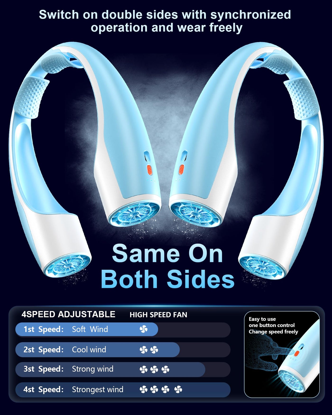 Q: What are the speed settings available on the Rohent Neck Fan?A: This neck fan offers 4 adjustable speed settings, allowing you to customize the airflow from a gentle breeze to a powerful burst of cooling, suitable for various situations.