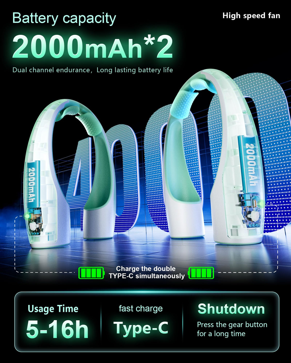 Q: What materials are used in the Rohent Neck Fan?A: The neck fan is made from aviation-grade lightweight and environmentally friendly ABS material, ensuring comfort for long-term use. It also features a silicone support frame that enhances stability and wear comfort.