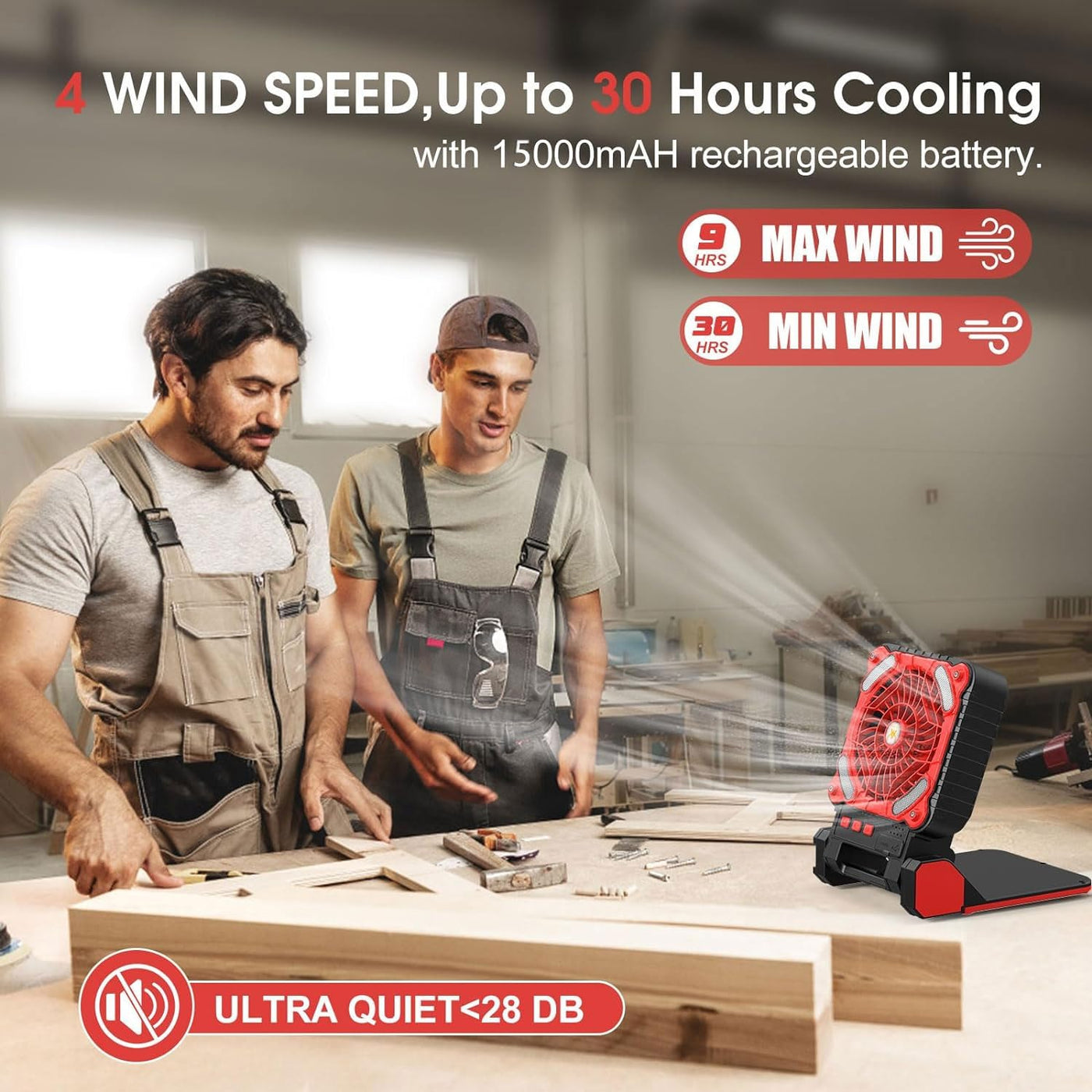 Q: How long does the battery of the Solar Camping Fan last on a full charge?A: The Solar Camping Fan features a built-in 15000mAh rechargeable battery that can provide continuous operation for 6 to 30 hours, depending on the speed setting used.