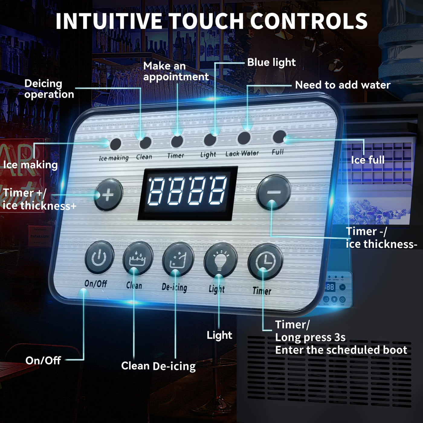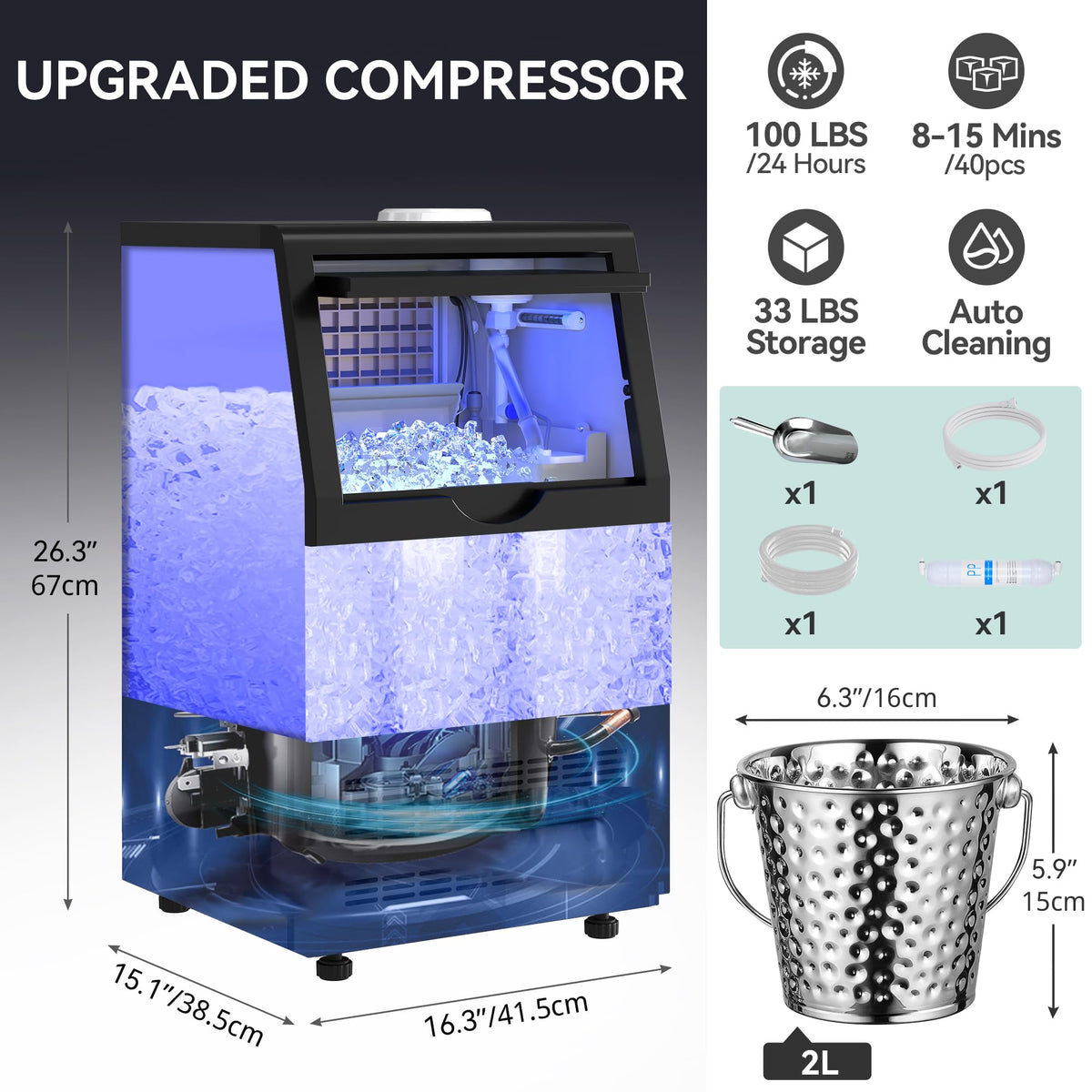 Commercial Ice Machine 100Lbs/24H: Yitahome Commercial Ice Machine Features Advanced Freezing Technology To Produce 100 Lbs Of Ice Per Day Via Low Noise Operation With A 33Lbs Storage Bin; Each Cycle Only Takes 8-15 Minutes To Produce 40 Pcs Of Ice; Of Course, We Provide A Supplementary 2-Liter Ice Storage Bucket To Hold Any Extra Ice Cubes | 2 Way Water Refill & More Flexible: This Ice Maker Commercial Supports 2 Ways To Add Water Or Gallon Bottled Water; You Can Get Different Tastes Of Ice Cubes Due To Different Buckets Of Water, With The Upgraded Water Filter, Tap Water Can Be Transformed Into Purified Water To Elevating Ice Cube Quality; It Is Designed To Be Freestanding Or Under Counter, Allows You To Install It In A Variety Of Locations, Perfect As A Commercial Ice Machine And Household Ice Maker | Electricity Saving And Quiet: Cfc-Free Upgraded Compressor Allows The Commercial Ice Machine To Save Up To 35% On Electricity, Quickly Driving Up The Freezing System And Providing A Constant Supply Of Freshest Ice At Amazingly High Efficiencies. In Addition, It Operates Quietly, Providing You With A Comfortable Environment. The Ice Maker Is Perfect For Keeping Drinks At The Ideal Temperature For Offices, Homes, Restaurants, Bars, Hotels, Grocery Store, Parties And Hosting | Extended Cooling Time: The Ice Maker Machine Commercial Is Equipped With A 20% Thicker Cyclopentane Insulation Layer, Delivering Excellent Insulation Performance By Blocking External Heat. The Insulation Time Is Extended From 6 Hours To 8 Hours, Effectively Preventing Ice Cubes From Melting. Built In Blue Light, This Ice Making Machine Improves The Maintenance Time Of Ice, Slowing Down The Speed Of Ice Melting. Designed With Flip Cover, It Is Easy To Facilitate Ice Fetching With Given Ice Scoop | Advanced Intelligent Experience: Compared With Ordinary Ice Maker Machines, Operations Can Be Solved In This Smart Lcd Control Panel, Adjusting The Ice Thickness, One Key Cleaning, 24-Hour Reservation, Defrosting, Water Lack Reminders And Other Functions Can Be Realized With One Poke Seperately. Adjustable Bracket Not Only Keeps The Product Stable On Uneven Surfaces, But Also Prevents Moisture From Affecting The Product'S Circuitry