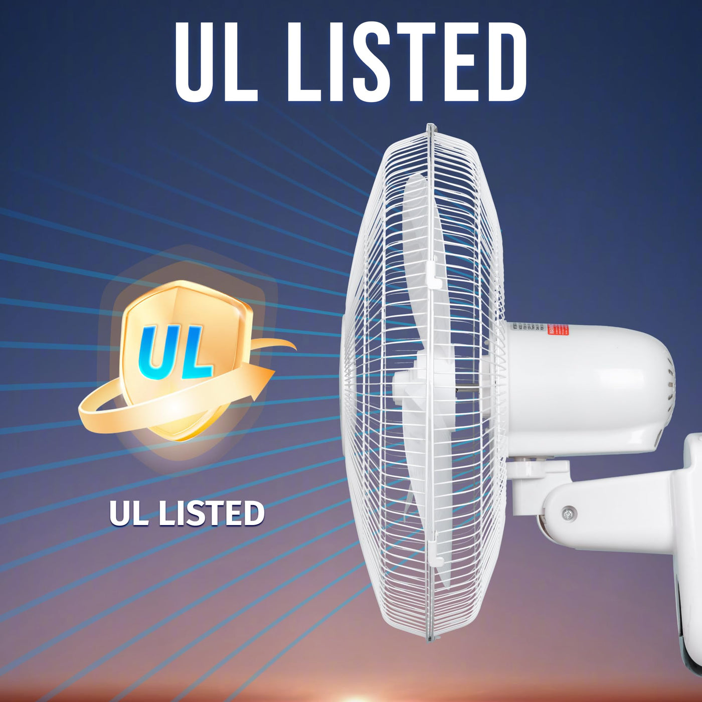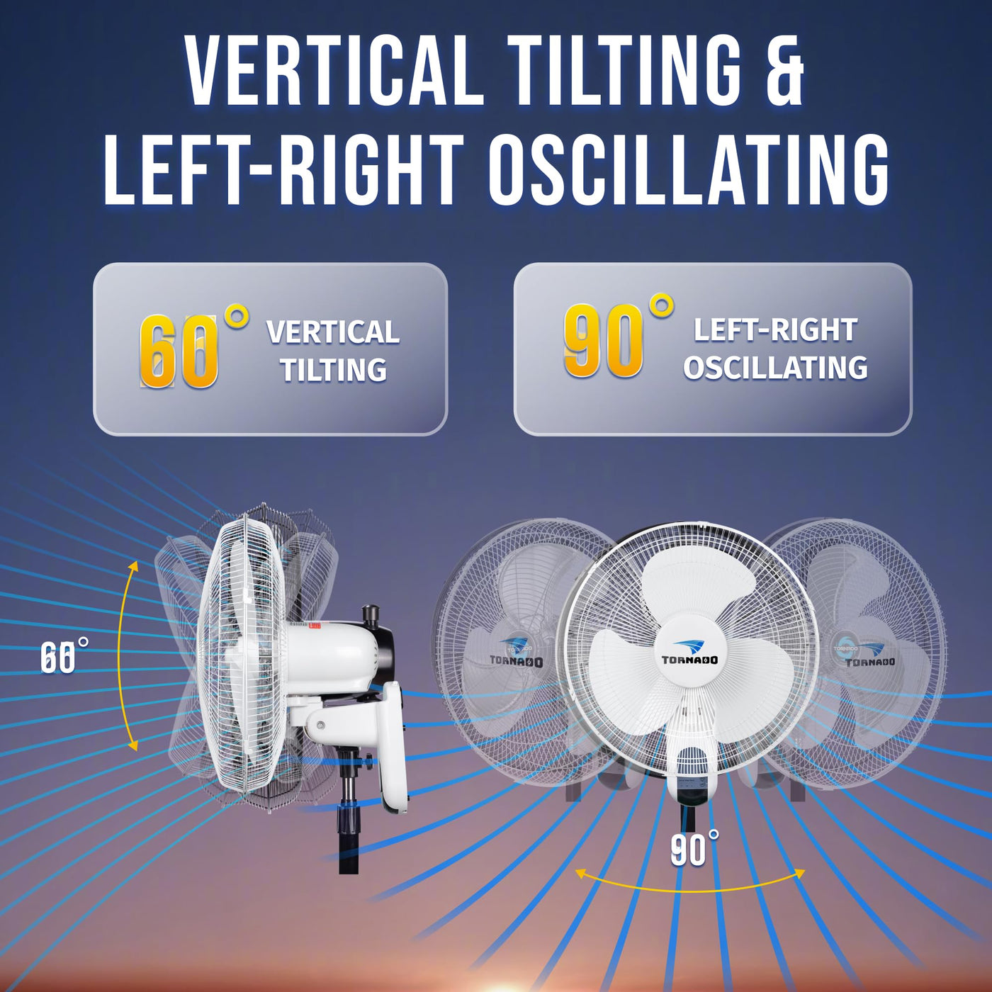 This Tornado 16 Wall-Mounted Fan Delivers Refreshing Airflow (2650 Cfm) Without Occupying Floor Space. Featuring Customizable Oscillation Patterns And 54Db Whisper-Quiet Operation (30% Quieter Than Traditional Wall Fans), Its Ideal For Residential Spaces, Commercial Greenhouses, Garage Workshops, And Indoor Agricultural Environments. | Engineered With Reinforced Steel Neck Support And Break-Resistant Abs Blades. Technical Specifications: 1460 Rpm Open Air Over Motor (3-Speed), 55W/120V/60Hz Energy-Efficient Operation (0.45A), 5.6 Spt-2-R Industrial Power Cord, Ul Safety Certified & Osha-Compliant, 1/13 Hp Motor With 1-Year Limited Warranty. | Features 90