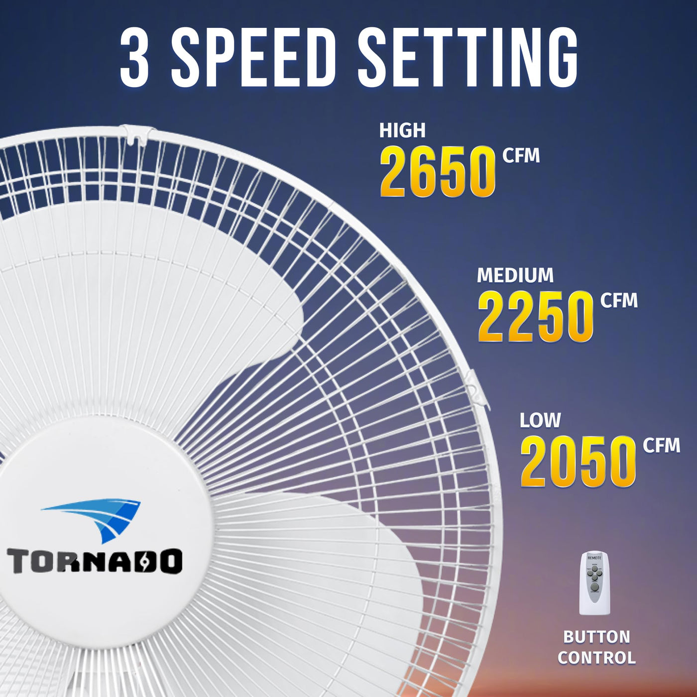 Tornado 16 Inch 3 Speed Oscillating Wall Mount Fan For Home, Remote Control Included, Adjustable Tilt 2650 Cfm 6 Ft Cord Ul Safe