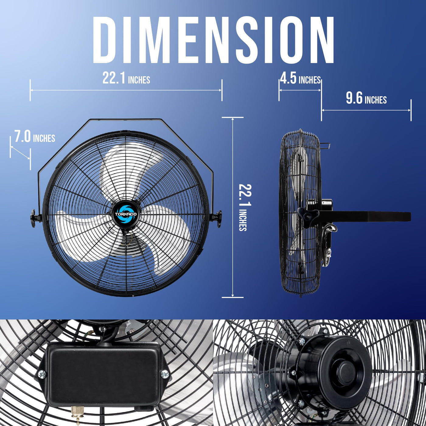 The Tornado 18 Inch High Velocity Metal Industrial Workstation Wall Mount Fan. Ideal For Industrial, Commercial, Residential, Shops, Patio, Backyard, Warehouse, And Workstations. Not Graded For Outdoor Use. | Made From Durable Aluminum And Powder Coated Steel Construction, Rust-Resistant Grille. Premium Teao Ball Bearing Motor. Extra-Long 6 Ft Sjt-R Power Cord. 1 Amps, 1500 Rpm, 4150 Cfm, 120V, 110 Watts, 60 Hz, 1/6 Hp. Meets Osha And Ul507 Standards. | Air Delivery With 3 Speed Settings 4150/3700/3450 Cfm. With A Heavy Duty Thermally Protected Direct Drive Ac Totally Enclosed Ball Bearing Motor, Protects The Motor From Workshop Debris And All Other Dust. Full 180 Degrees Vertical Tilting Angle. | Easy Assembly And Use: Need 1 Expansion Bolt (M10X80) To Hang It On The Concrete Or Metal Rack. Not Recommended On The Wood Wall. Hang It From The Wall Or The Ceiling Only Takes You A Second | Tornado'S Latest Technological Advancement Is Designed To Minimize Noise Output, 65 Decibels Maximum. Quiet And Efficient Metal Wall Fan.