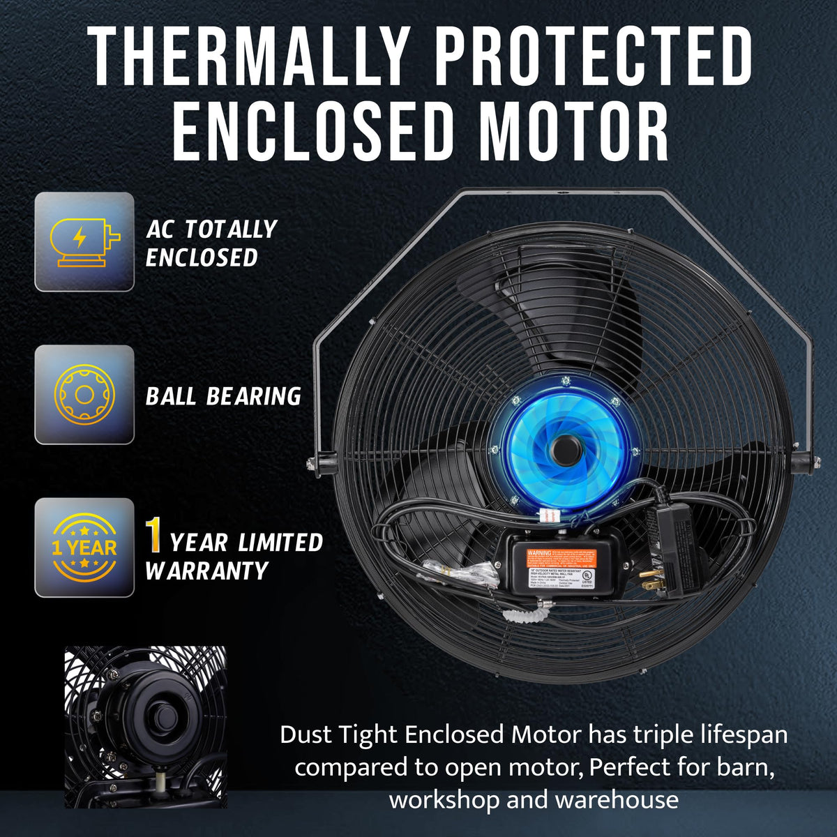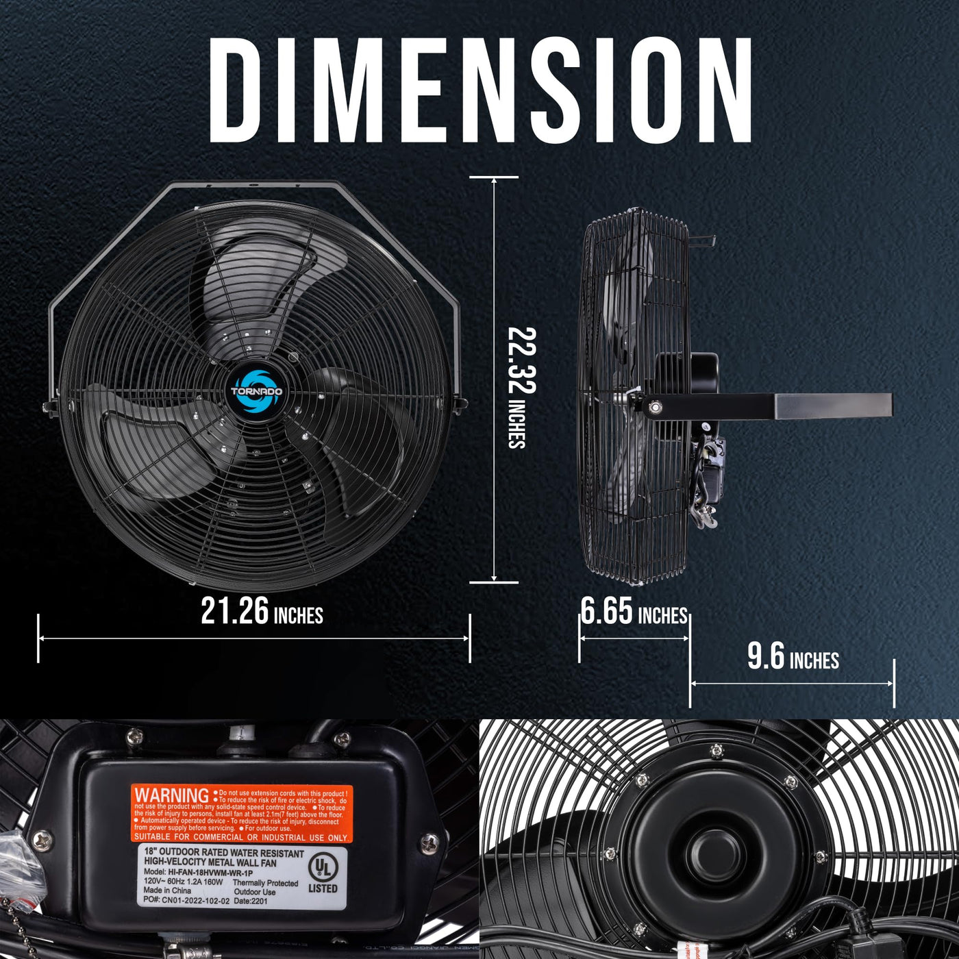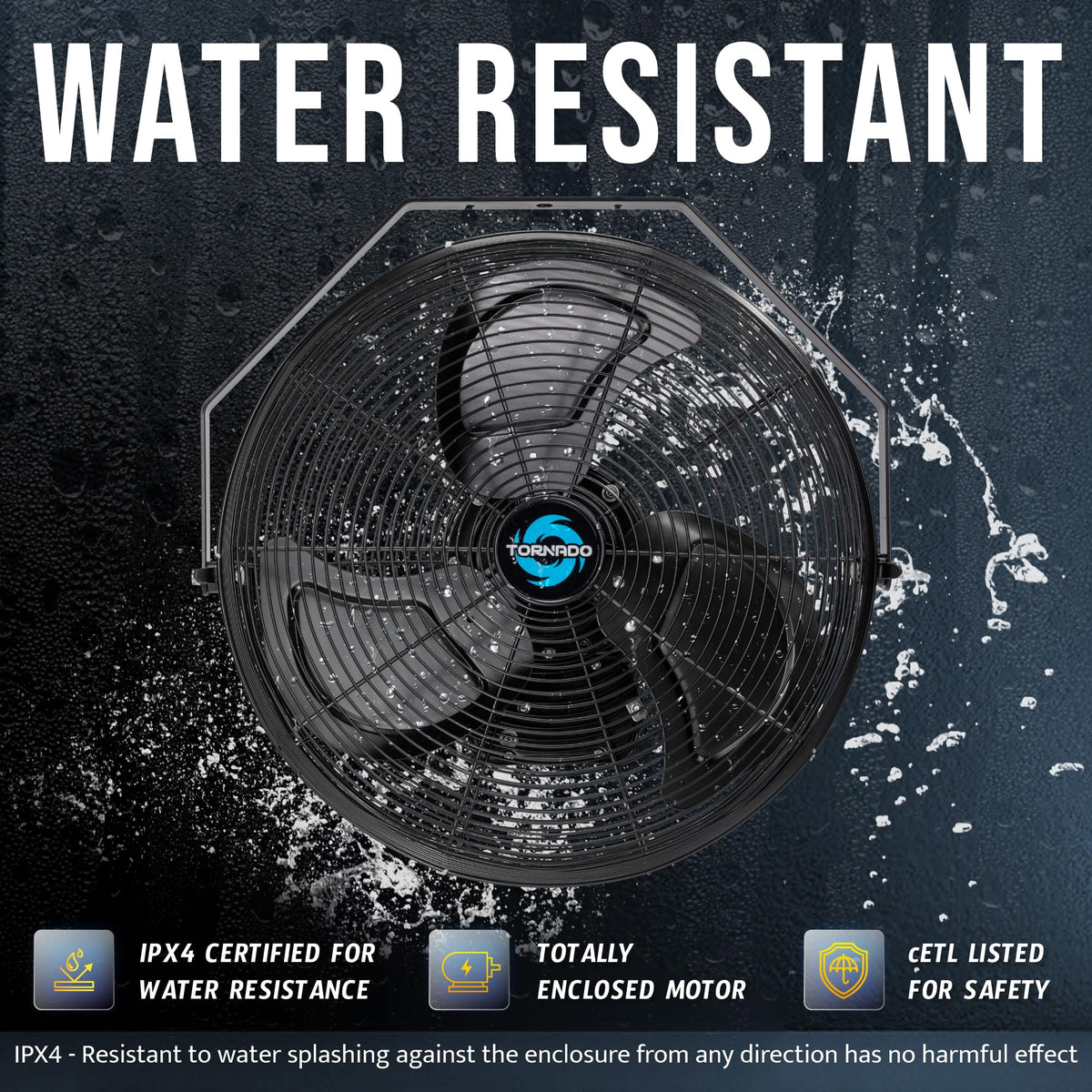 The Tornado 18'' Outdoor Rated Ipx4 Water-Resistant High Velocity Metal Industrial Workstation Wall Mount Fan.Outdoor Use Friendly. Ipx4 - Resistant To Water Splashing Against The Enclosure From Any Direction Has No Harmful Effect. | Made From Durable Aluminum And Powder Coated Steel Construction, Rust-Resistant Grille. Premium Teao Ball Bearing Motor. 6.6 Ft Sjtw Power Cord. 1.2 Amps, 1500 Rpm, 4150 Cfm, 120V, 160 Watts, 60 Hz, 1/6 Hp. Meets Osha And Ul507 Standards. | Air Delivery With 3 Speed Settings 4150/3700/3450 Cfm. With A Heavy Duty Thermally Protected Direct Drive Ac Totally Enclosed Ball Bearing Motor, Protects The Motor From Workshop Debris And All Other Dust. Full 180 Degrees Vertical Tilting Angle. | Easy Assembly And Use. Need 1 Expansion Bolt (M10X80) To Hang It On The Concrete Or Metal Rack. Hang It From The Wall Or The Ceiling Only Takes You A Second. Turn It Into A Misting Fan With The Purchase Of The Tornado Misting Kit (Sold Separately). | Tornado'S Latest Tech Minimizes Noise, 65 Decibels Maximum. Ideal For Industrial, Commercial, Residential, Outdoor Patio, Resorts, Warehouse Loading Dock, And Workstations. Gfci Plug For U.S. Outdoor Electrical Safety.