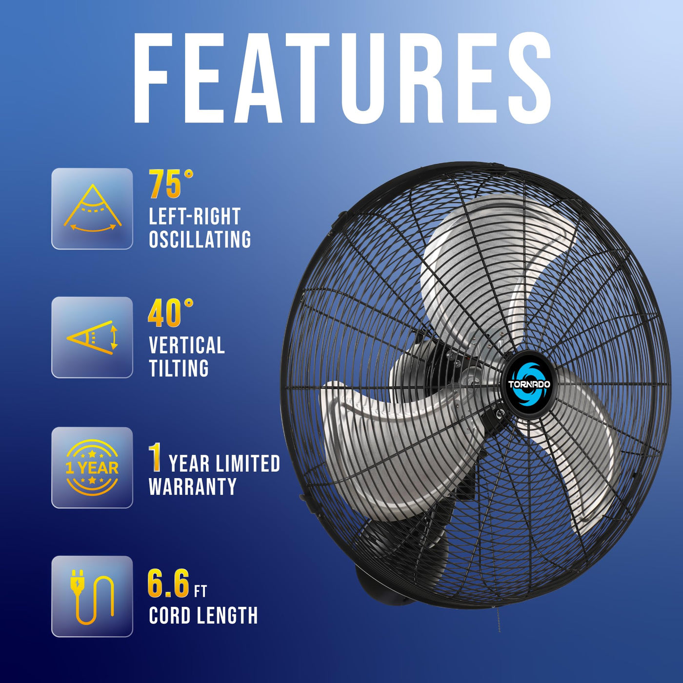 Tornado 20 Inch Pro Series High Velocity Oscillating Wall Mount Fan For Industrial, Commercial, Residential Use 3 Speed 5250 Cfm