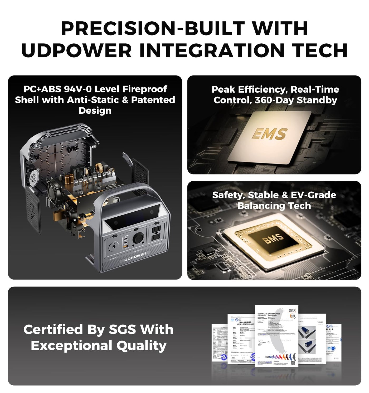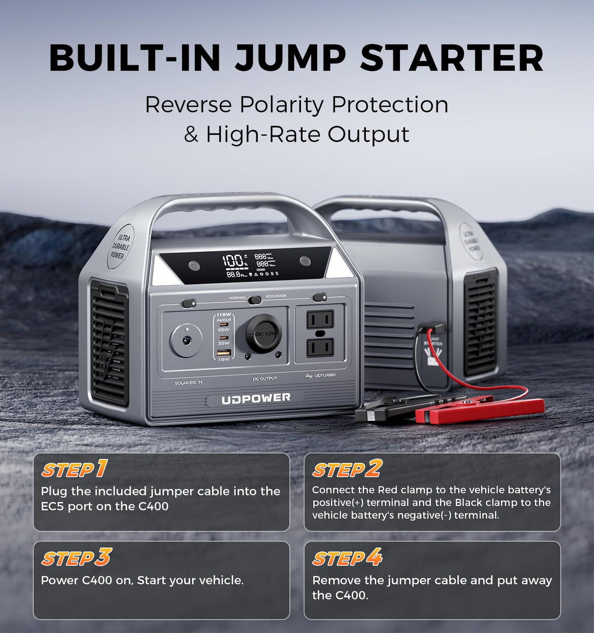 Power Wherever You Need It The Udpower Aco400 Portable Power Station Delivers Clean, Reliable Energy For Outdoor Adventures, Home Emergencies, And Professional Use. With Its Lifepo4 Battery, Its Built To Outlast Traditional Power Stations While Staying Eco-Friendly. Key Features: 400W Ac Output (800W Surge With Ud-Turbo) - Handles Heavy-Duty Devices Like Blenders Or Medical Equipment (Cpap Compatible). 65W Usb-C Pd + 18W Usb-A - Fast-Charge Phones, Tablets, And Laptops Simultaneously. Solar/Car/Ac Charging - Recharge Via Sunlight (150W Solar Input), Car, Or Wall Outlet In 1.6 Hours (165W Max Input). Smart Lcd Screen - Real-Time Monitoring Of Wattage, Battery Life, And Temperature. Zero Power Drain - Auto-Shutdown After 10 Hours Of Inactivity. Whats In The Box? 1* Udpower Ac0400 Power Station 1* Udpower 96W Usb-C Charger 1* Car Charging Cable 1* Jumper Cable 1* User Manual Warranty & Support 3-Year Limited Warranty. Contact Udpowers U.S.-Based Team At Support@Udpwr.Com For Lifetime Technical Support. Note: For Best Performance, Store In A Dry Place (32F-104F) And Recharge Every 3 Months If Unused.