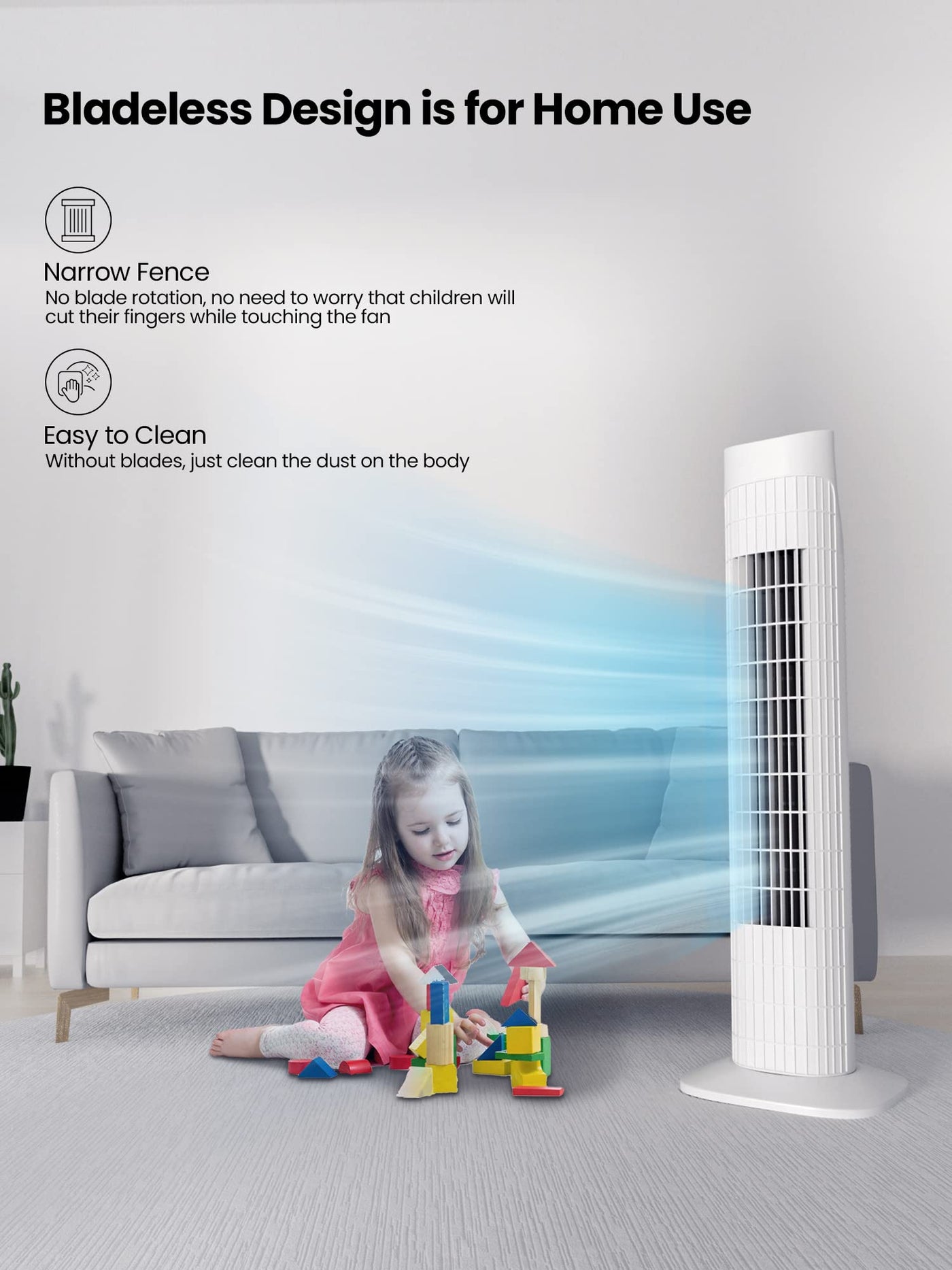 Q: Is the Uthfy Tower Fan safe for children?A: Yes, the Uthfy Tower Fan is designed with a bladeless technology, making it safer for children by eliminating the risk of injury from spinning blades. Its quiet operation further enhances safety and comfort.