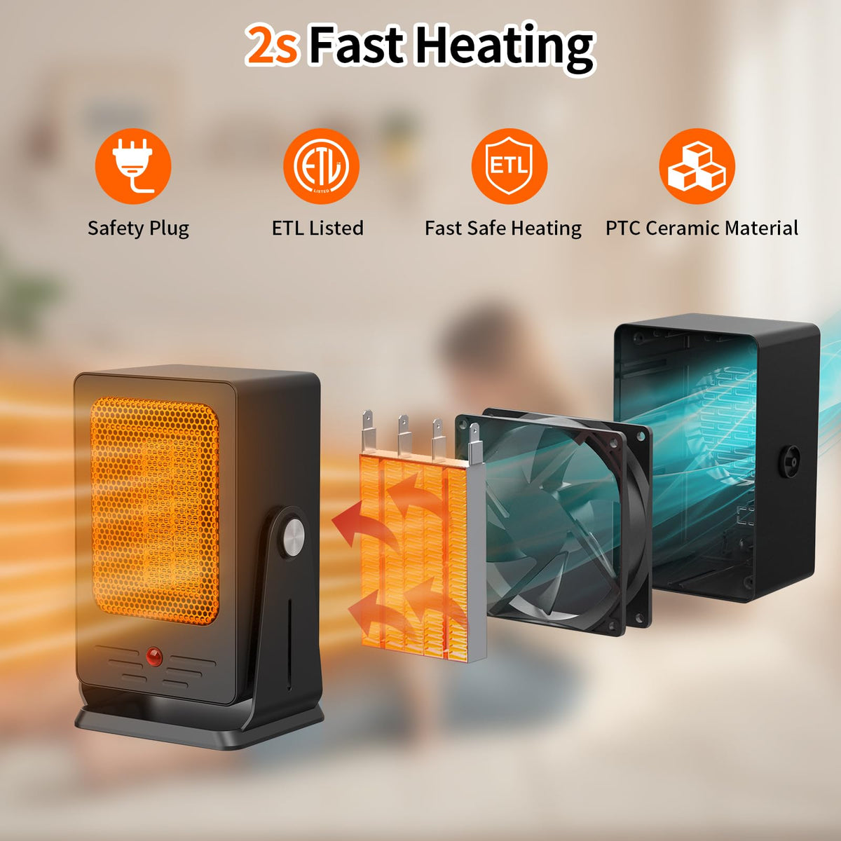 Verminget Portable Space Heaters For Indoor Use,Desktop Heater With 900W Ptc 2S Fast Heating, 30 Adjustable Angle Design Small E