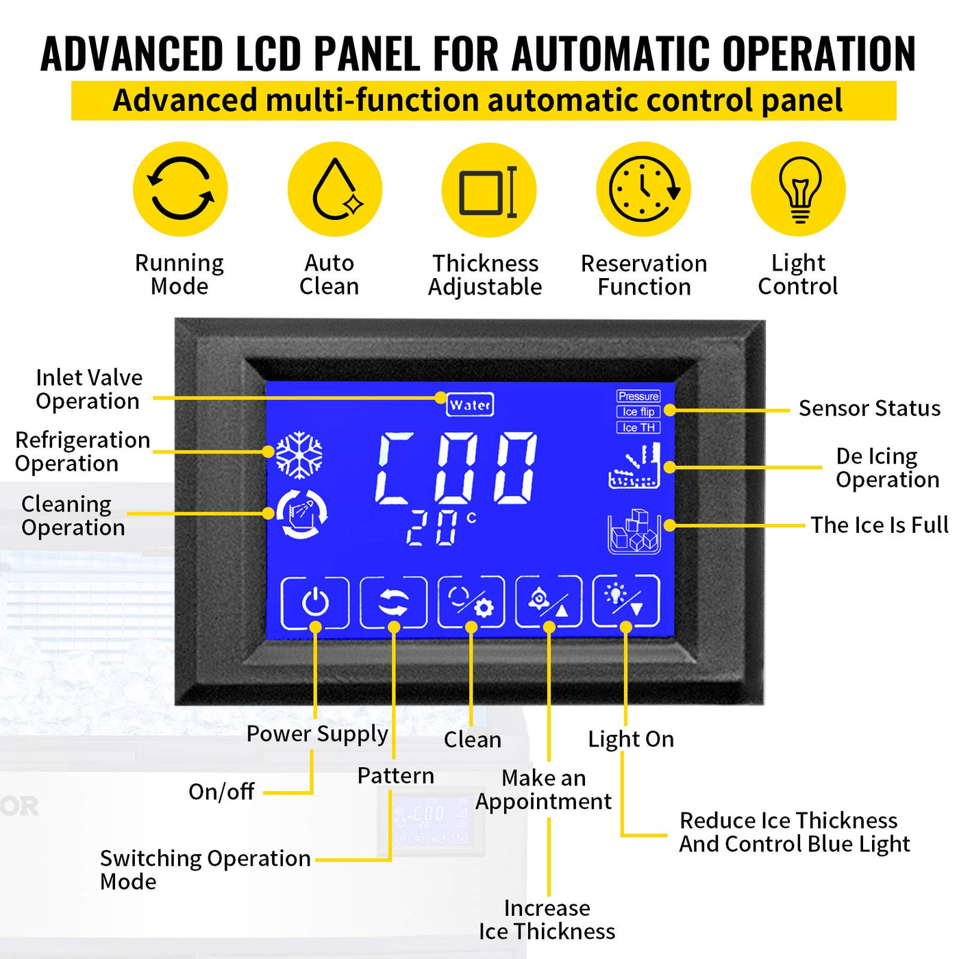 Kindly Note:1.The Ice Machine Is Not Suitable For Outdoor Use.The High Temperature Will Seriously Reduce The Ice Production. Choose A Well-Ventilated Area With The Ambient Temperature Between 10C (50F) And 32C (90F). This Appliance Must Be Installed In An Indoor Area Without Wind, Rain, Water, Spray, Or Drips.2.The Ice Machine Requires A Continuous Water Supply With The Pressure Of 0.04-0.6 Mpa (5.8-87 Psi). The Temperature Of The Waterinflow Should Be Between 5C (41F) And 25C (77F) For Proper Operation.3. Air-Cooled Ice Machine Relies On Air Circulation To Dissipate Heat, So It Is Necessary To Reserve A Certain Space (5 Inch For Reference )Before And After To Facilitate Heat Dissipation.4. To Prevent Any Internal Damage, It Is Very Important To Keep Refrigeration Units (Like This One) Upright Throughout Their Journey. Please Leave It Standing Upright And Outside The Box For 24 Hours Before Plugging It In.5.The Filter Element Must Be Removed Before Using The Filter, And The Packaging Film Is Torn Off And Then Tightened.6.Heat Insulation Function Prevents Ice Cubes From Melting For 5-7 Hours.(The Specific Duration Of Ice Cube Is Affected By Ambient Temperature.)(Suggested: Please Transfer The Ice Cubes To Refrigerator , If You Don'T Use Them Instantly).7.The Adjustment Only Affects The Next And Subsequent Ice Making Cycles.8.When The Ice Full,Lights Up, The Appliance Stops Working. It Will Work Again After You Take Out The Ice.