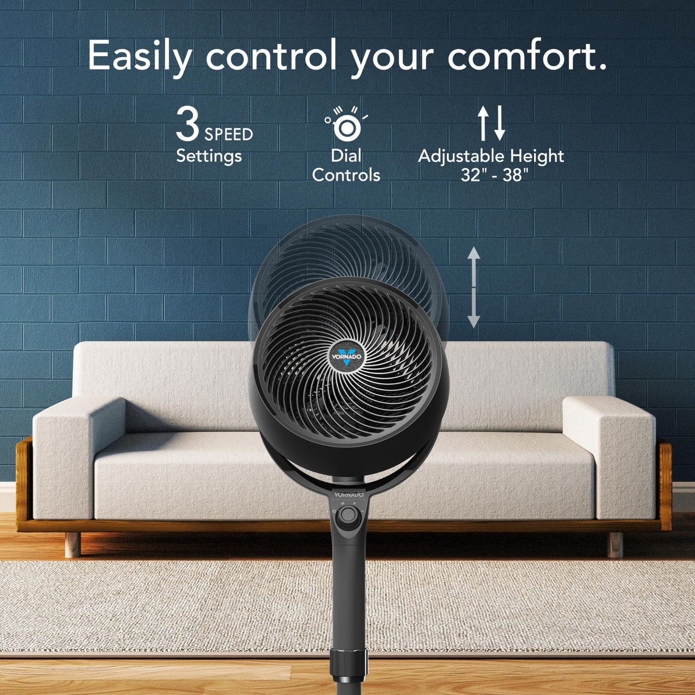 Q: What are the adjustable height options for the Vornado 683 fan?A: The Vornado 683 fan features an adjustable standing height that ranges from 32 inches to 38 inches. This allows users to direct airflow exactly where it's needed, making it versatile for various room settings.
