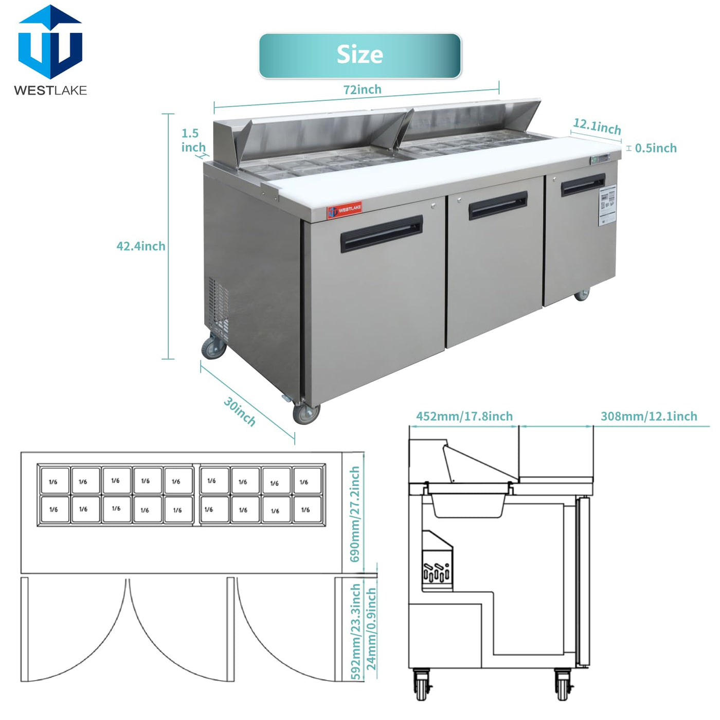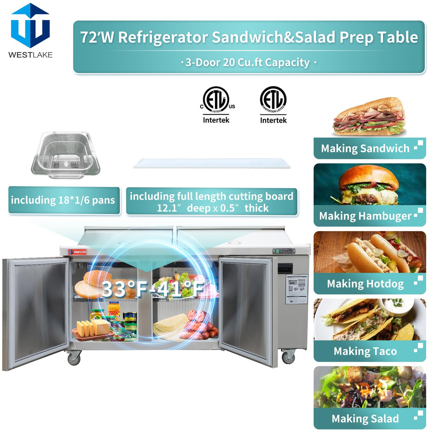 Westlake 72'' W 3 Door Refrigerator Sandwich&Salad Prep Table Commercial Stainless Steel Counter Fan Cooling Refrigerator With 1