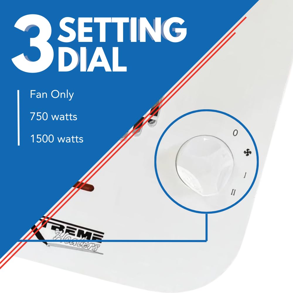 Q: How do the heat settings work on the Xtreme Heater?A: The heater has two heat settings: 750 Watts for maintaining comfortable temperatures and 1500 Watts for quickly warming up your living space. This allows you to choose the setting that best suits your heating needs.