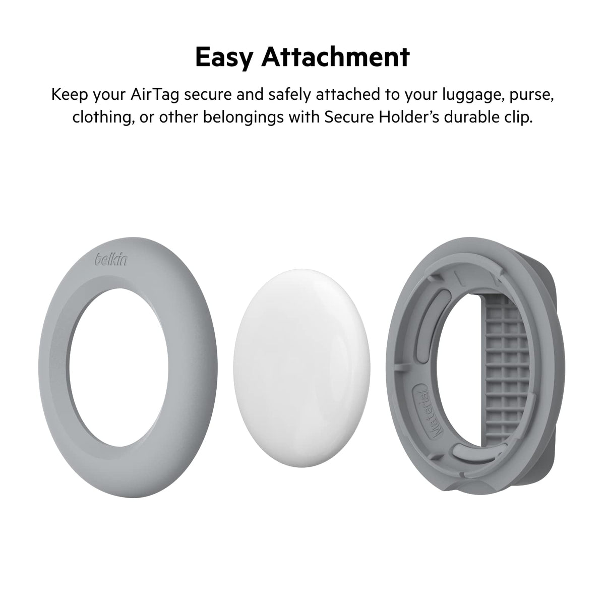 Our Secure Holder with Key Ring combines an innovative snap-and-lock design with aesthetically pleasing raised edges to keep your AirTag secure and scratch-free. With a sturdy spring loaded clip, our AirTag cases are easily attached to your clothes, backpacks, pets, luggage, and so much more. Available in white, light gray, dark gray, and black, these Air Tag cases can stylishly track your belongings 24/7. Your AirTag will be safely contained in our secure holder while keeping its elegant design and custom engravings on full display. The Secure AirTag Holder doesn't just offer around-the-clock protection of your most important items. With its sturdy clip, small frame and color selections, the AirTag Holder with clip makes an excellent accessory for everything you bring with you. Belkin Apple AirTag Holders are stylish, and secure. While the spring loaded clip is perfect for attaching to most items, our durable airtag cases are also available in Keychain, Strap, Wire loop, and Carabiner form factors, so you can keep your belongings protected no matter what they are or where you store them. Complete your travel look with your own personal AirTag case, and never again worry about losing what matters most.
