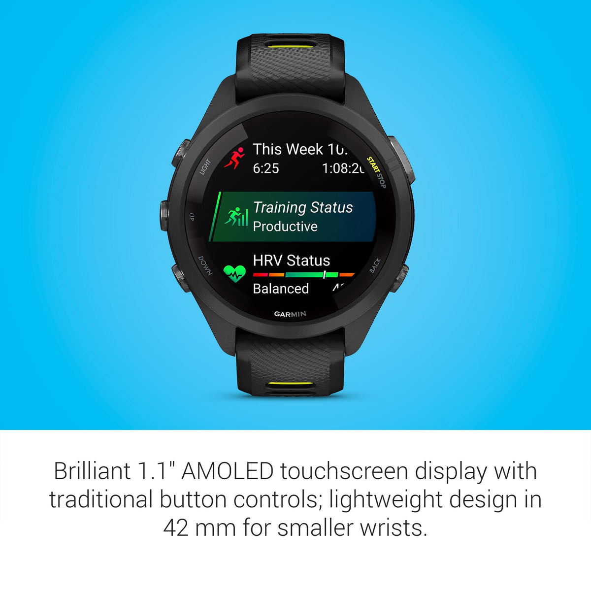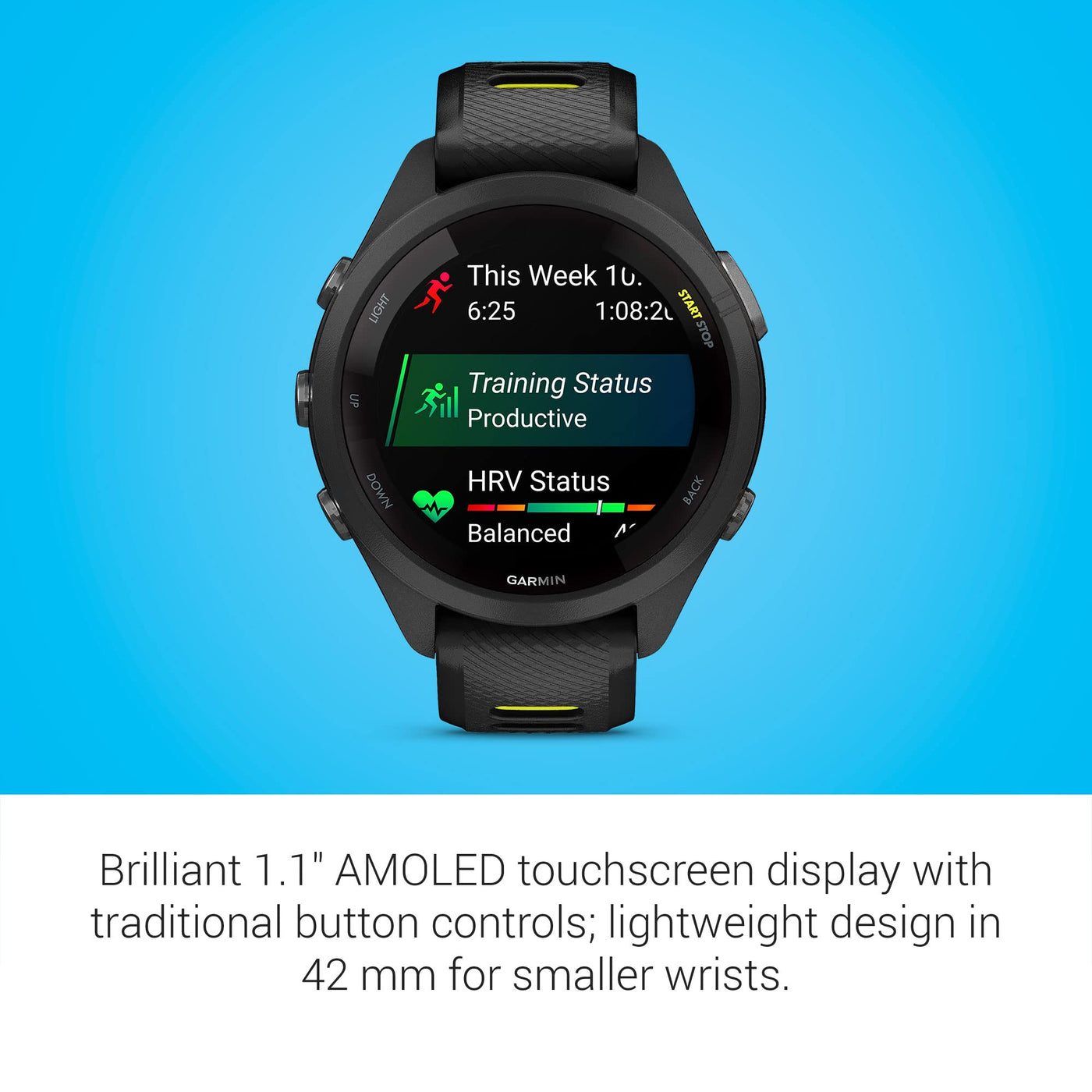 Garmin Forerunner 265S Running Smartwatch, Colorful Amoled Display, Training Metrics And Recovery Insights, Black And Amp Yellow