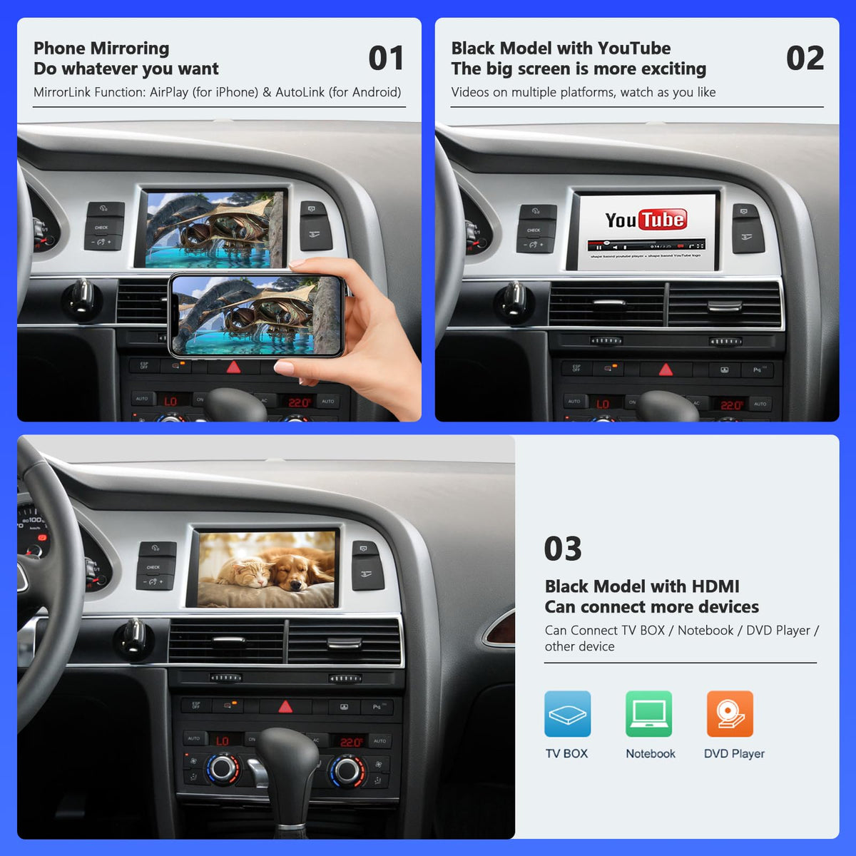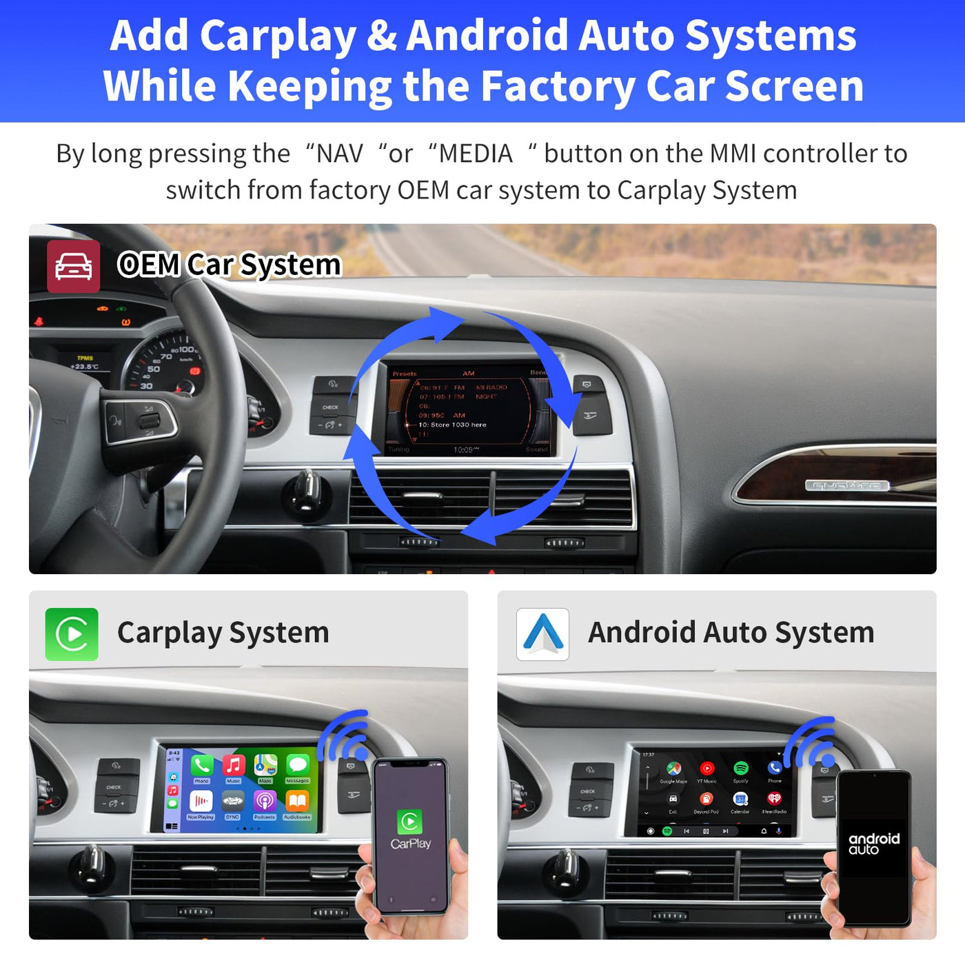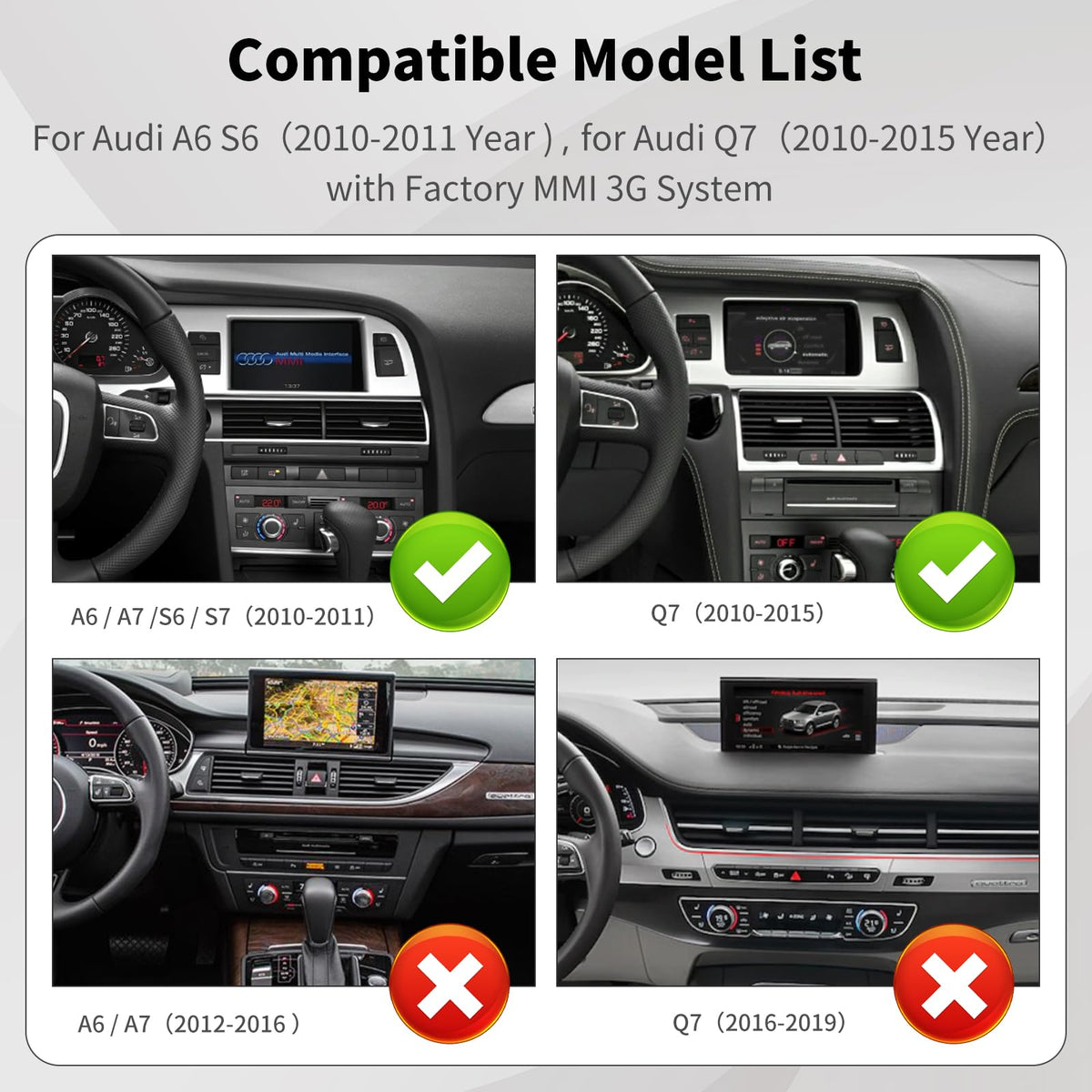 Road Top Wireless Carplay Android Auto Module Receiver Box For Audi A6 S6 2010-2011 Year, For Audi Q7 2010-2015 Year, Carplay Retrofit Kit Decoder, Support Mirror Link, Reverse Camera Functions So What Are The Benefits Of This Device. Besides The Obvious Of Adding Carplay, Android Auto Or Mirrorlink Wirelessly Or Via Wired Usb. It Works With Your Usual Factory Controls Including Steering Controls You Also Retain The Factory Interfac. All You Have To Do Is Click The Button With The Star Symbol To Switch From Original And To The New One And Vice Versa. Features: 1.Support Wireless Carplay:Pairing Via Bluetooth, Transfer Via Wifi. 2. Support Wired Carplay:Use Your Original Factory Usb Cable. 3. Support Wireless/Wired Android Auto: Support Wired Or Wireless Link Depends On Your Phone Model. 4. Mirrorlink Function: Compatible With Mobile Phone Wireless Projection Technology (Air Play/Mirroring),Support Wireless Airplay For Iphone, Support Wired Autolink For Android Phone. 5. Switch Between The Two Systems: Long Press Nav Or Media Button From Mmi Knob Controller, You Can Switch The System Between The Original Mmi System. 6. Carplay Work With Original Microphone. 7. Original Steering Wheel And Buttons Control. 8. Support Original Factory Camera And Aftermarket Camera, As Well As Front Camera, Rear Camera/Radar/ Tracking Screen Input. The Rear View Camera Will Work Automatically When You Put In Rear Gear. Friendly Note: Install This Product Need Use Your Aux ,Please Make Sure That Your Aux Is Activation. If You Know How To Take Out Your Host Device, You Can Install It By Yourself, If You Dont Know, I Suggest You To Find A Professional Master To Install. You Can Also Get Help From Us Directly During The Installation. Quality Warranty: We Offer Limited Hardware Warranty 1 Year From The Date Of Purchase. Package Include: 1 X Carplay Retrofit Kit