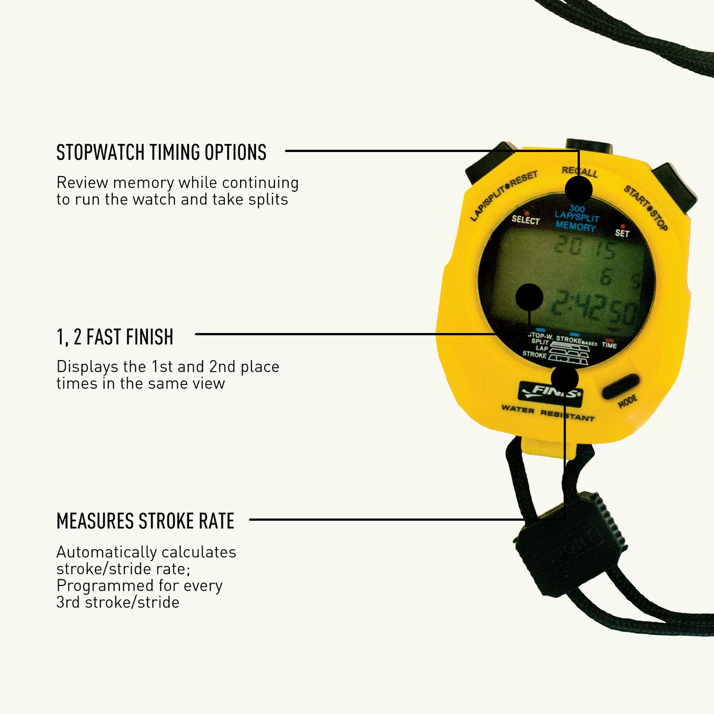 Split Timing Stopwatch: Allows For 300 Splits And Review Of Both Cumulative And Lap Splits; Clearly Displays The Current Split And How Many Splits Have Been Taken | Long-Lasting: Battery Life Offers Approximately 5 Years Of Use | Active Time Review: Allows For Review Of The Current Memory While Taking Splits; No Need To Stop The Watch To Review Memory | Ldc Display: Clearly Displays Cumulative Running Time And Current Lap Running Time | Stroke Rate Mode: Automatically Calculates Stroke/Stride Rate; Programmed For Every 3Rd Stroke/Stride