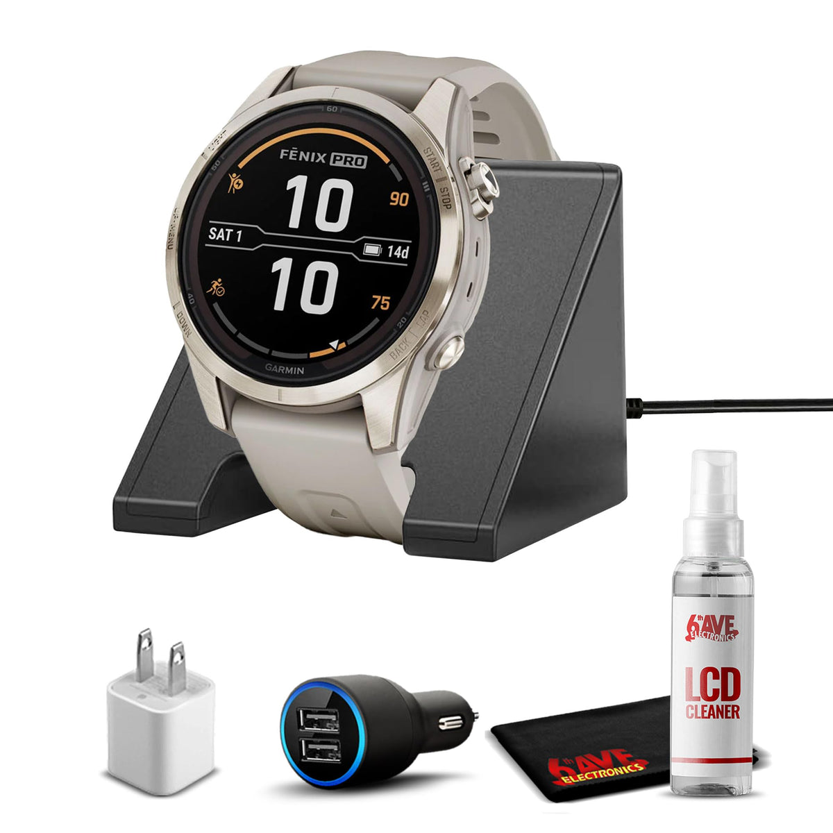 Fenix 7S Pro Sapphire Solar Is The Ultimate Multisport Gps Smartwatch Optimized For Smaller Wrists And Designed To Perform All Day, Every Day. Get Weeks Of Battery Life With The Scratch-Resistant Power Sapphire Solar Charging Lens. Meet Any Challenge With Advanced Training Features Such As Hill Score, Which Measures Your Climbing Performance Over Time, And Real-Time Stamina Updates To Gauge Your Stamina Potential. For A More Complete Picture Of Your Health, Training And Recovery, Tap In To 24/7 Health And Wellness Monitoring With Advanced Sleep Tracking, Hrv Status, Pulse Ox And More (This Is Not A Medical Device, And Data Presented Is Intended To Be A Close Estimation Of Metrics Tracked; Pulse Ox Not Available In All Countries). When The Sun Sets, Use The Led Flashlight To Stay Visible Or Find Your Way. Navigate With Preloaded Topoactive Maps And Ski Resort Maps; Download Even More Regions For Global Adventures. Adventure Far Off The Grid With Up To 14 Days Of Battery Life In Smartwatch Mode With Solar Charging In 3 Hours Of Direct Sunlight (50,000 Lux) Per Day. Gain Superior Positioning Accuracy While Optimizing Battery Life, Thanks To Multi-Band Gps With Satiq Technology.Extra Items From 6Ave:Watch Charging Standusb Car & Wall Adaptercleaning Kit