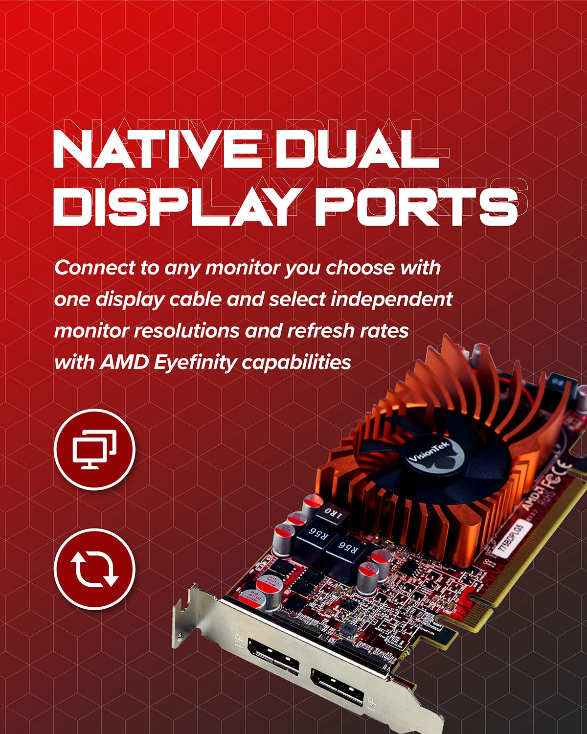 The Visiontek Radeon 7750 Sff 2Gb Gddr5 2X Dp Allows You To Power The Latest Displays At The Highest Resolutions. With Full Support For 4K Displays You Can View Even More Content Than Ever. Independent Resolutions Allow You To Have One 4K Monitor And One High Definition (1080P) Or Any Combination Of The Two. A Short Form Factor Design Allows You To Add Additional Monitors To Short Form Factor, Mini Atx, And Other Small Case Systems. Bus Powered Design Means You Don T Have To Worry About Additional Power Pins. Note: This Is Not An Hdmi Graphics Card. This Graphics Card Has 2X Displayport Outputs Both Of Which Support Audio. If Signal Type Translations Are Required For The Desired Configuration, Active-Type Adapters Are Required. 3840X2160 Resolution Can Be Achieved On A 4K Monitor While Also Using A Cable That Supports This Resolution. Sff Graphics Cards Refer To The Height Of The Unit And Bracket Which Allows For Use In Systems That Are Not Full-Height Desktops. Two Graphics Cards Can Be Used In Tandem So Long As The Computer Supports The Operation Of Two Simultaneously.