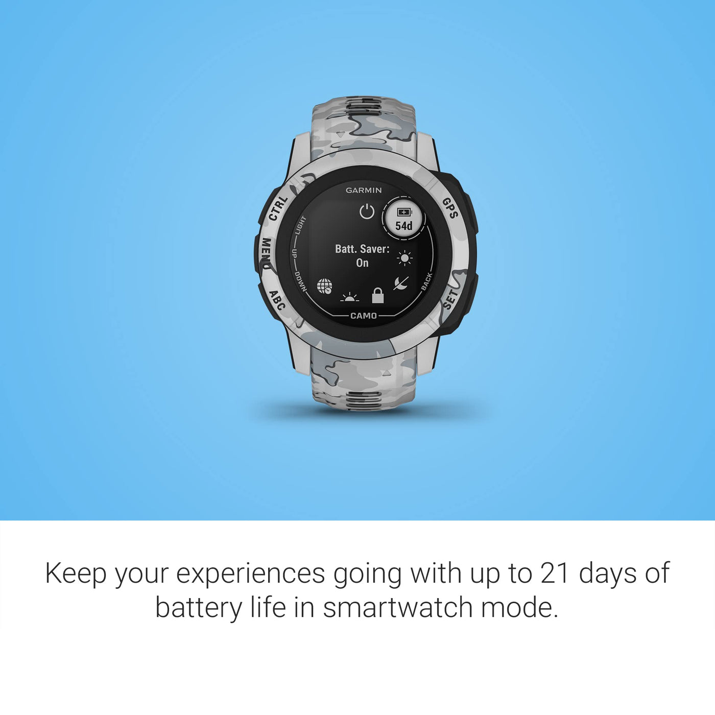 Q: How long does the battery last on the Garmin Instinct 2S?A: The battery life of the Garmin Instinct 2S can last up to 21 days in smartwatch mode and up to 22 hours in GPS mode, making it suitable for extended outdoor activities or daily wear.