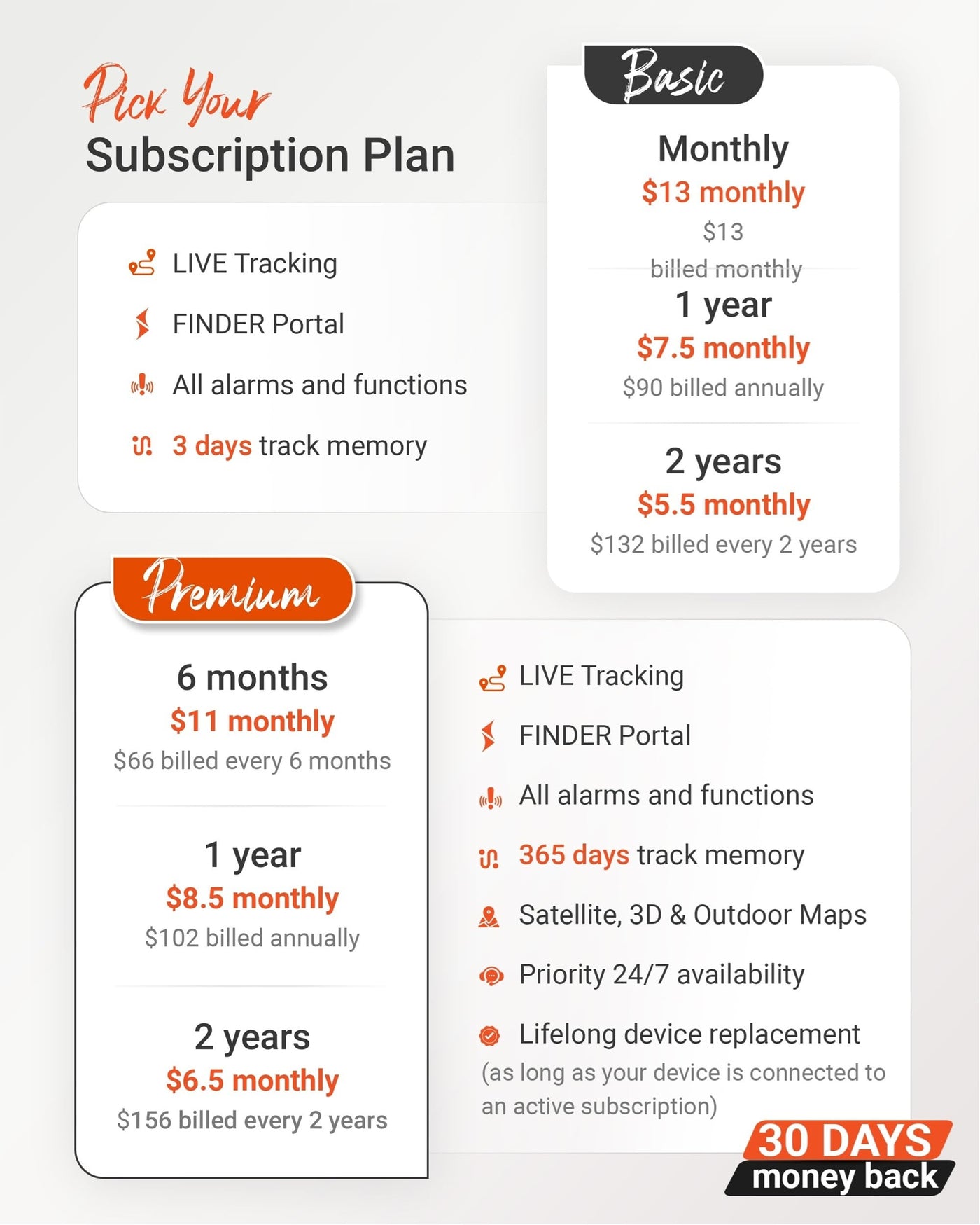 Q: What subscription plans are available for the PAJ Allround Finder 4G, and what do they include?A: The PAJ GPS tracker comes with a SIM card and offers flexible subscription plans, including Premium and Basic options. You can choose plans ranging from monthly to every two years, starting at $5.50 per month. Each plan includes device replacement and 24/7 customer support in multiple languages.