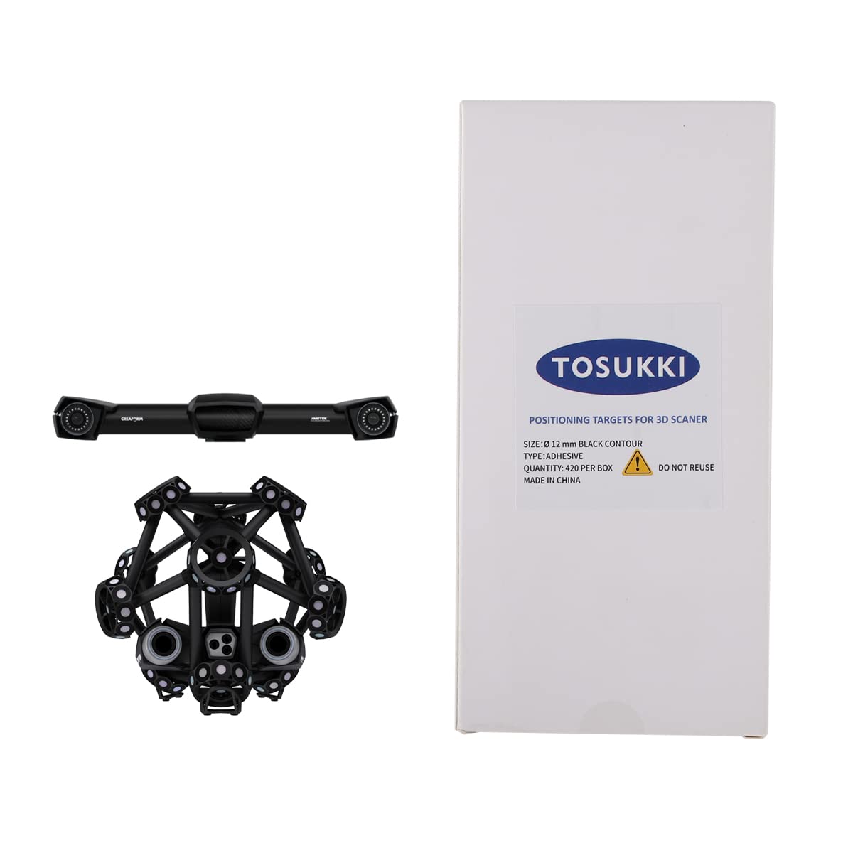 Q: What is the quantity provided in a box of TOSUKKI positioning targets?A: Each box of TOSUKKI Ø12 mm Positioning Targets contains 420 adhesive markers, allowing for extensive use in multiple scanning projects.