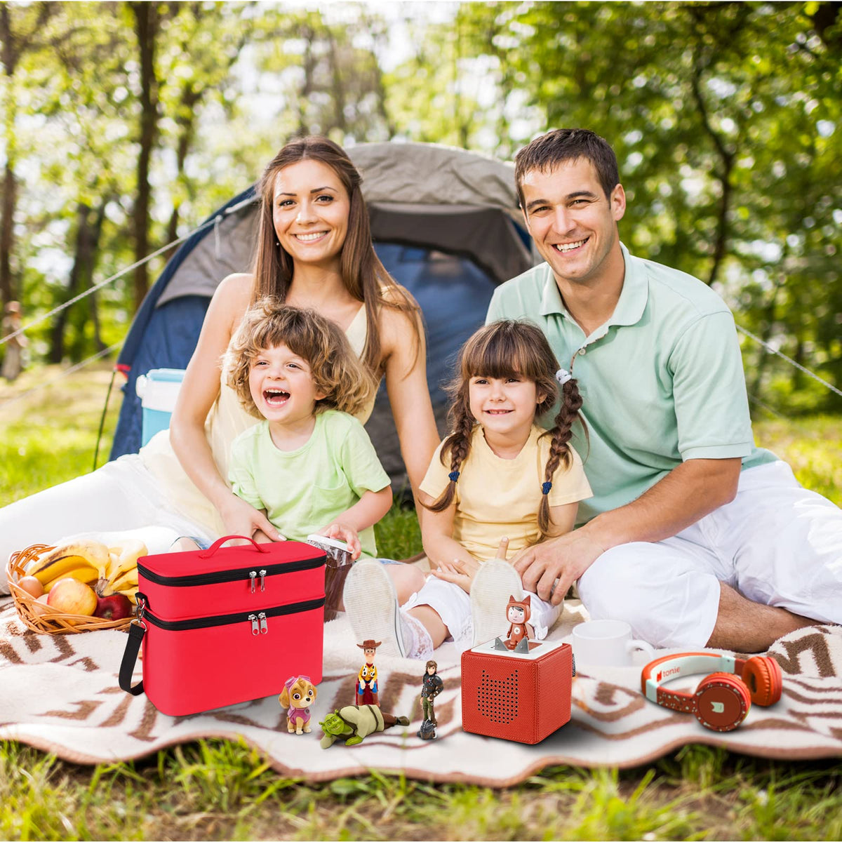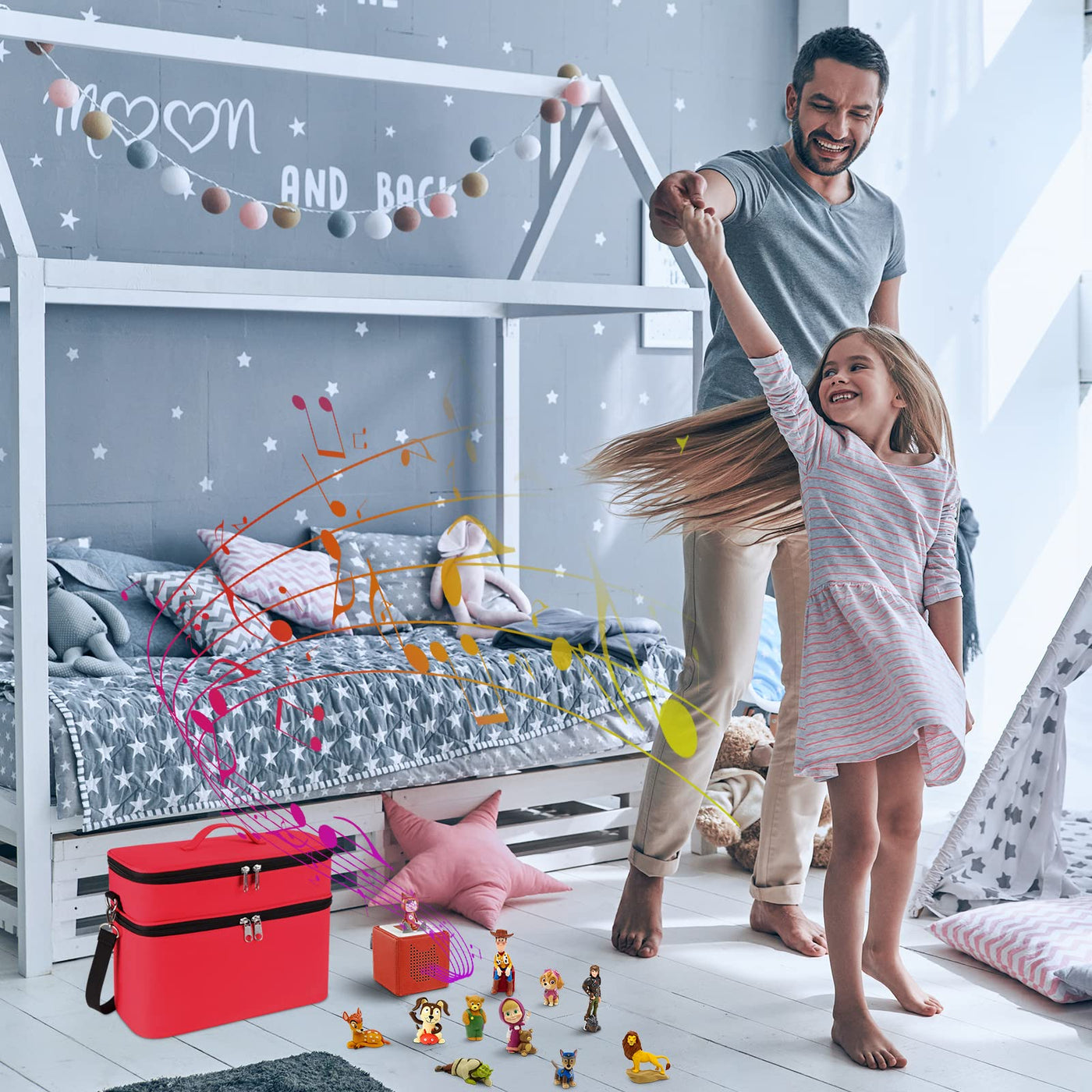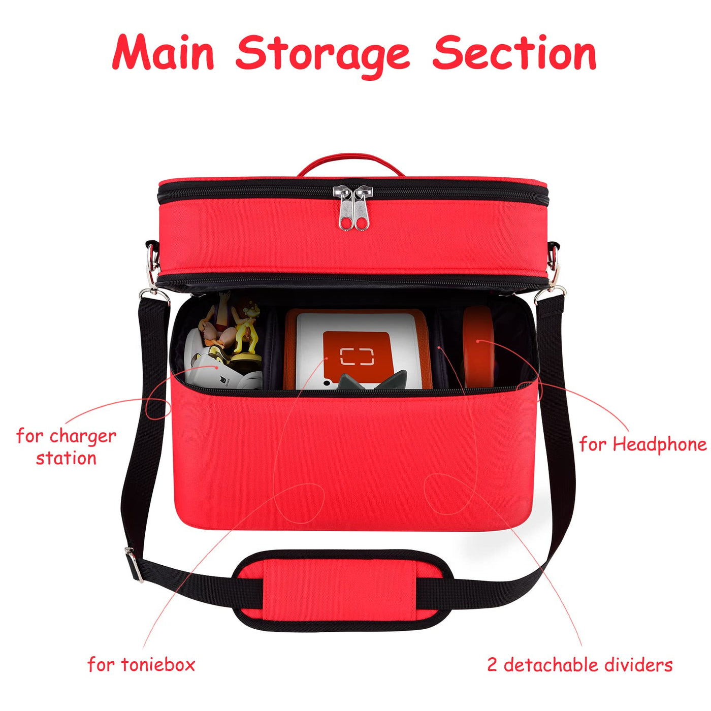 Large Carrying Case For Toniebox, Tonies Figures, Headphone & Charging Station No Bad Smell, With Raw Material Of Fabric. 2 Layers' Design, With Down Section For Toniebox, Headphone & Charging Station, Top Section To Hold Tonies Characters & Small Items. 2 Detachable Fabric Dividers For Flexible Storage Need. This Carrier Storage Bag Will Be A Great Travel Companion For Your Music Box & Tonies Wherever Youre Out On A Picnic Or During A Trip. Detachable Shoulder Strap For Convenient Carrying Experience.