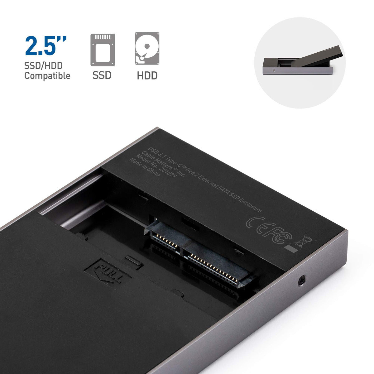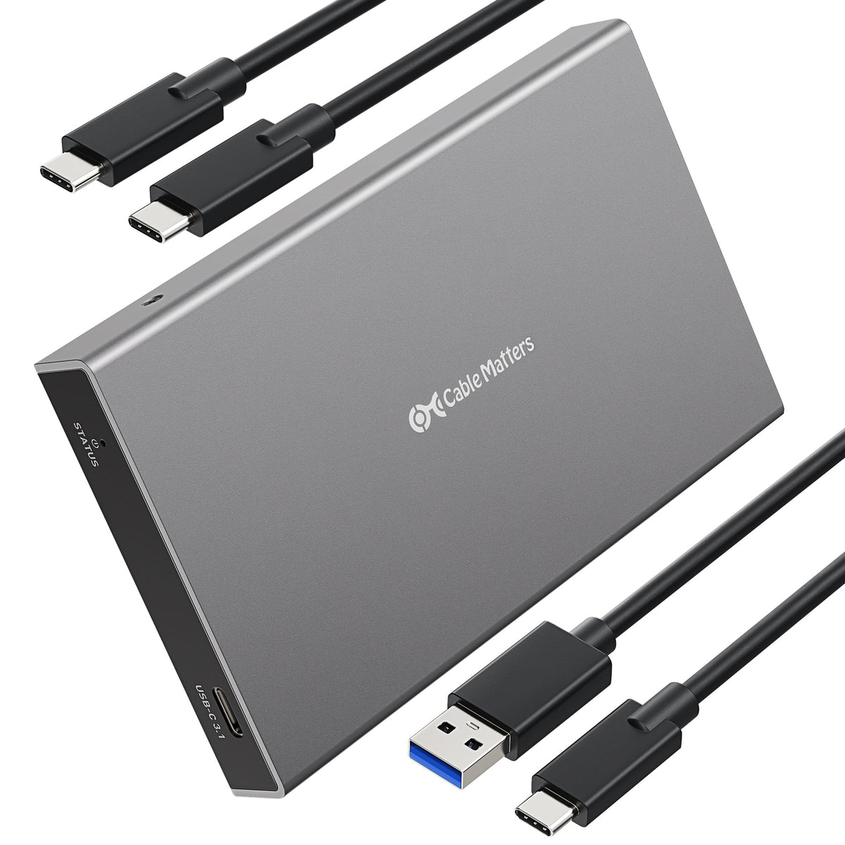 Cost-Effective External Storage The Cable Matters USB-C External 2.5" SSD Enclosure provides a convenient way to connect a 2.5" SSD or HDD drive to a computer. Add back-up storage to a computer with USB-A, USB-C or Thunderbolt 3. The SuperSpeed+ USB 3.1 10Gbps data transfer rate speed is supported when connected to a USB 3.1 Gen 2 compatible computer port.