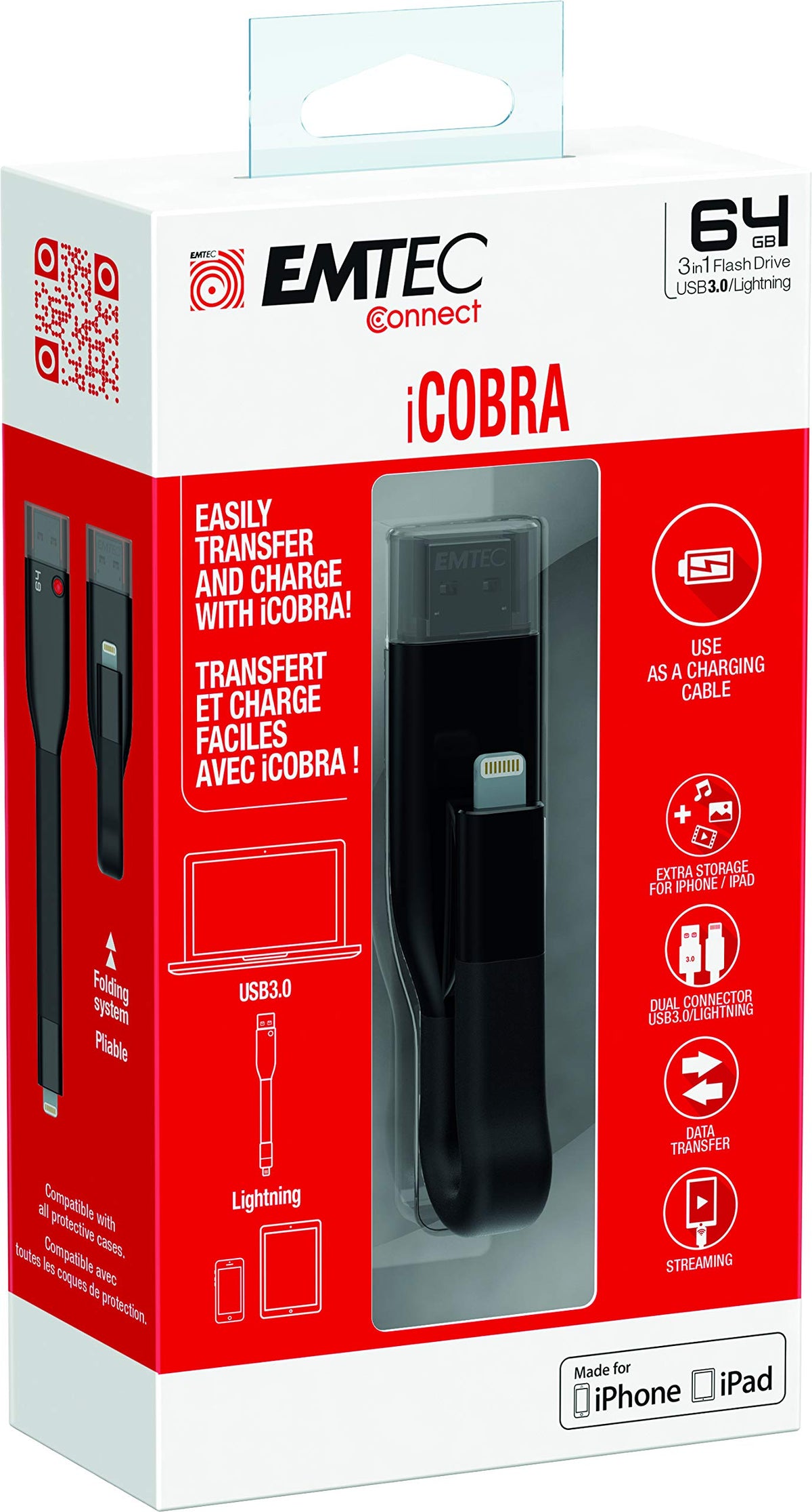 This 64Gb Lightning On-The-Go Usb 3.0 Flash Drive Quickly Allows You To Extend Your Iphone Of Ipad'S Memory. With The Icobra You Can Easily Transfer And Share All Of Your Files (Mp3, Photos, Videos, Etc..) Between Your Iphone, Ipad, Ipod & Mac. The Icobra Is Used With The User Friendly Emtec Connect App.